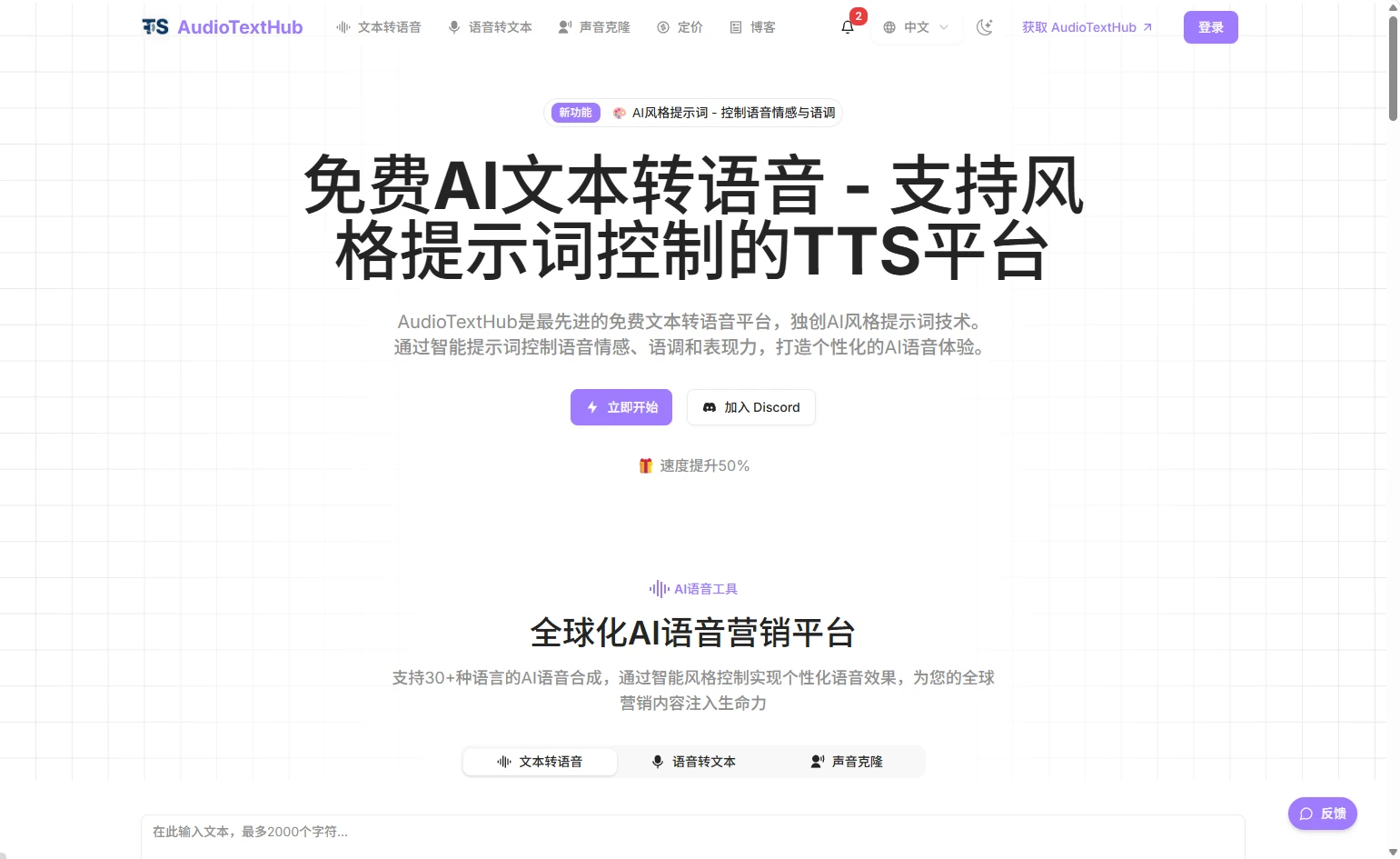 AudioTextHub是一个最先进的免费文本转语音平台,它独创了 AI 风格提示词技术,能够通过智能提示词控制语音的情感、语调和表现力。、