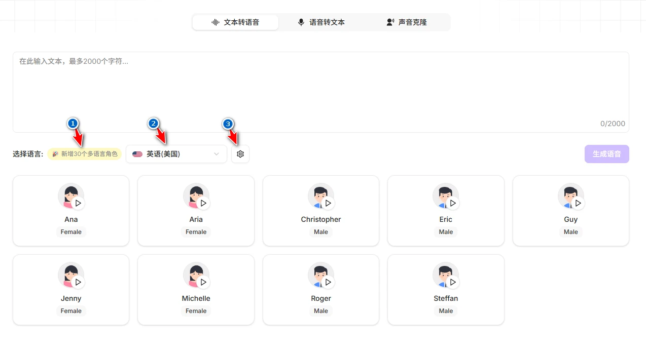 从导航栏可以看出,该站点目前支持文本转语音、语音转文本、声音克隆三种功能,继续往下滚动即可开始操作: