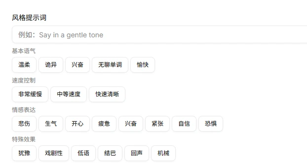高级TTS控制:不仅是基础设置 - 使用AI风格提示词控制情感、个性和表现力,让免费文本转语音更加生动。