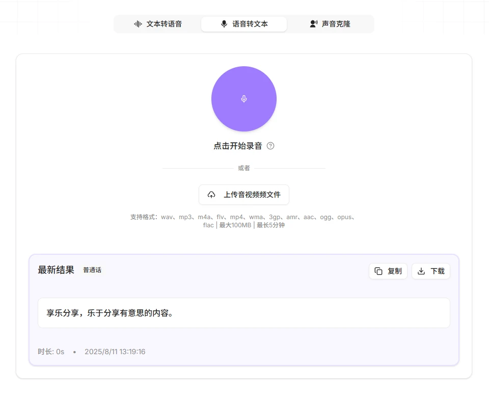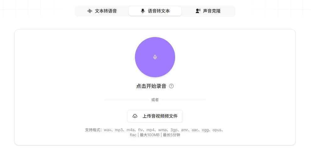 语音转文本方面我直接使用的是之前「文本转语音」功能里面的结果音频,当你切换到「语音转文本」的时候,可以看到下面的界面: