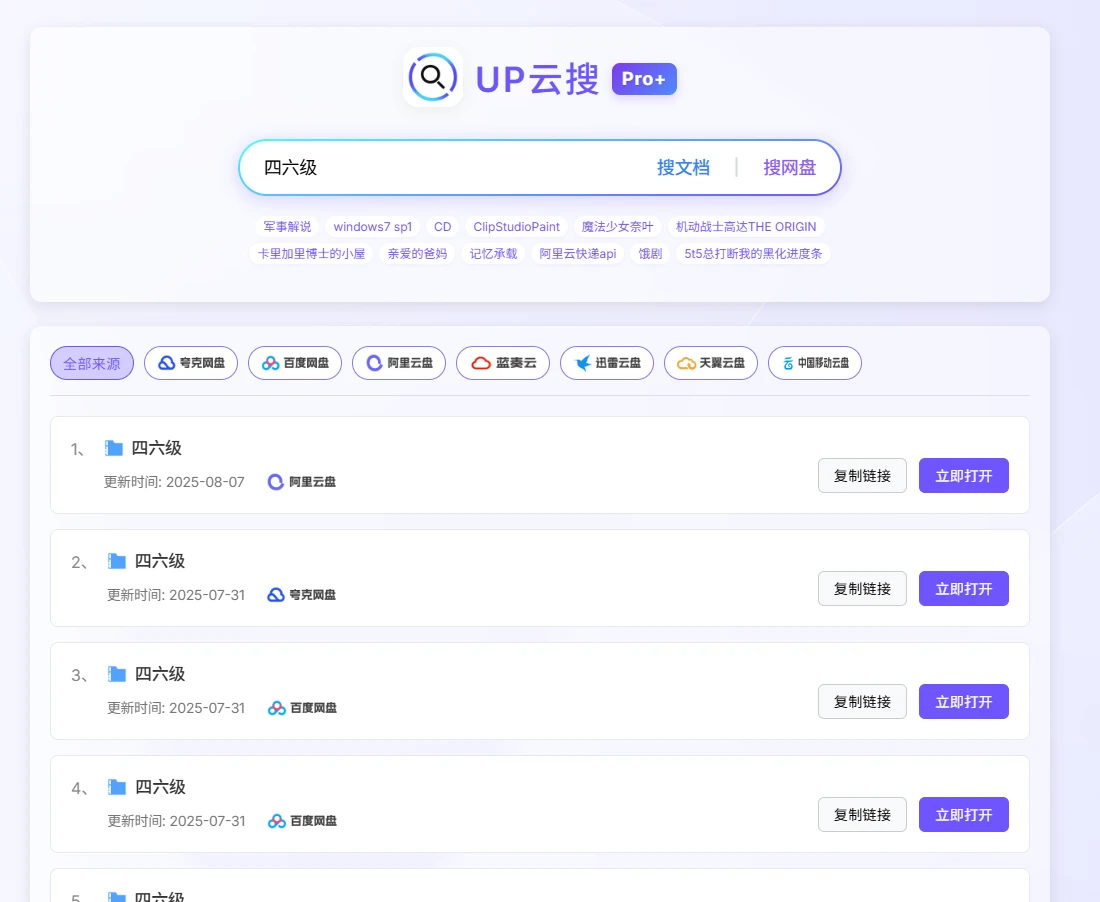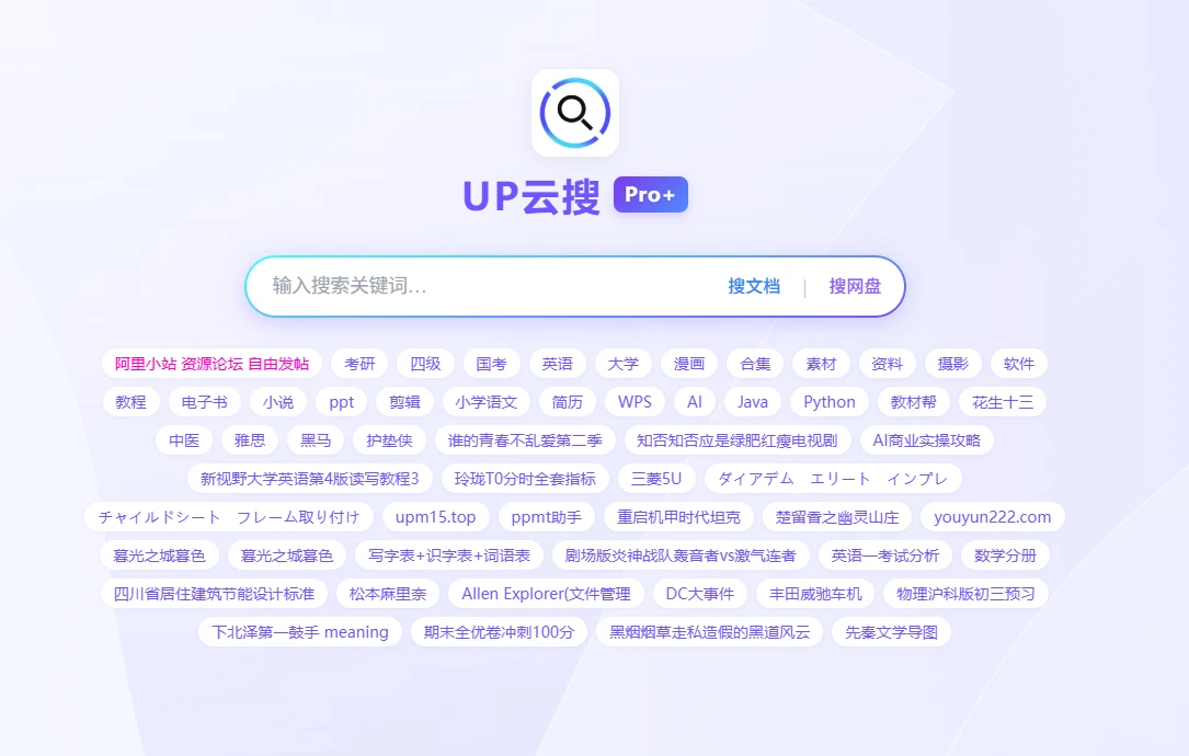 UP云搜是一个聚合型的网盘搜索站点,通过该站点,你可以直接一键搜索所有包含搜索关键词的大部分网盘资源内容,同时,它也支持文档搜索,和本站之前推荐的飞书搜索站点有点类似。