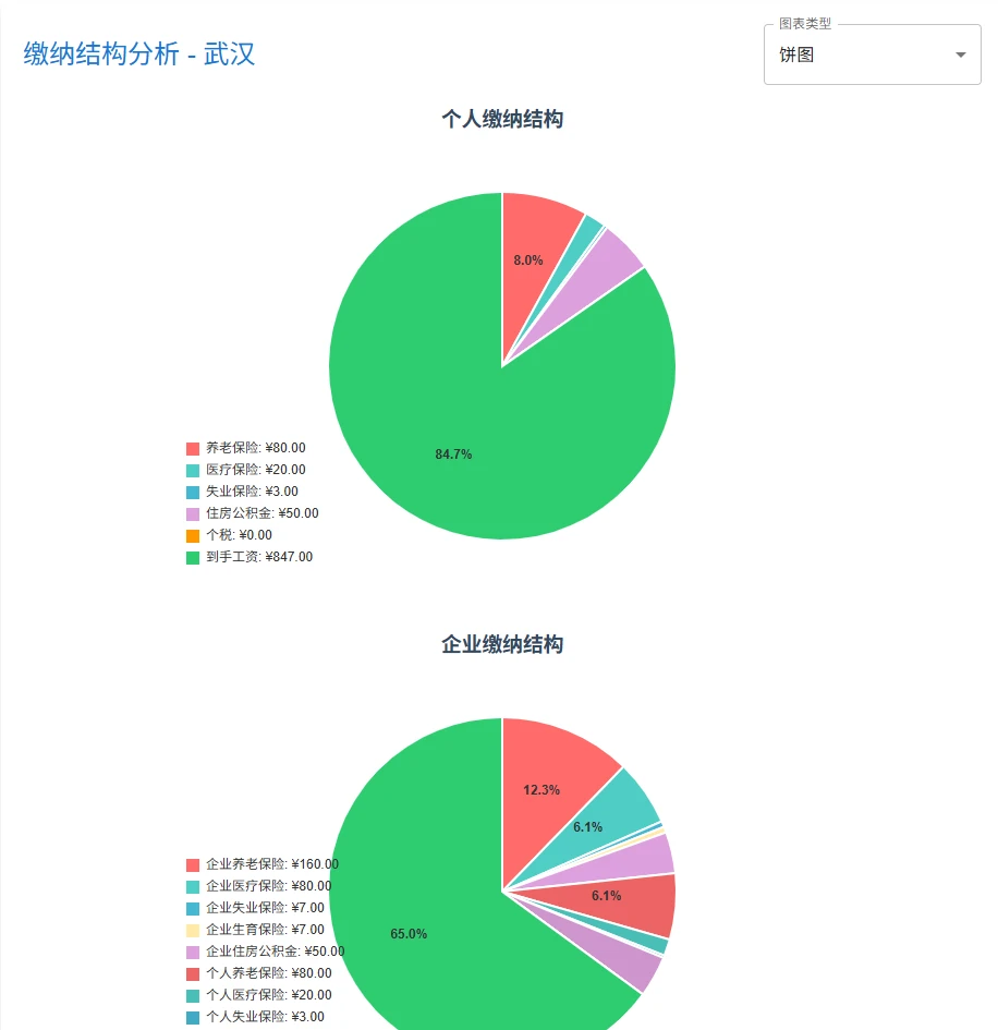 结果方面提供了缴纳明细表、全年逐月计算明细、缴纳结构分析三个动态数据,还有两个是补充说明的内容,动态数据部分截图如下: