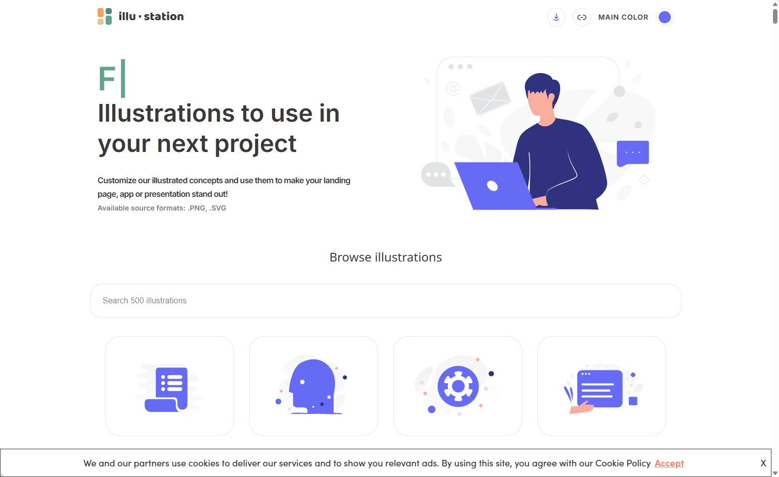 站点主要提供免费的插画和矢量图,可用于个人或商业项目,并且支持多种格式,包括PNG和SVG,针对SVG格式用户可以自定义插画的颜色和样式,以满足不同的设计需求。