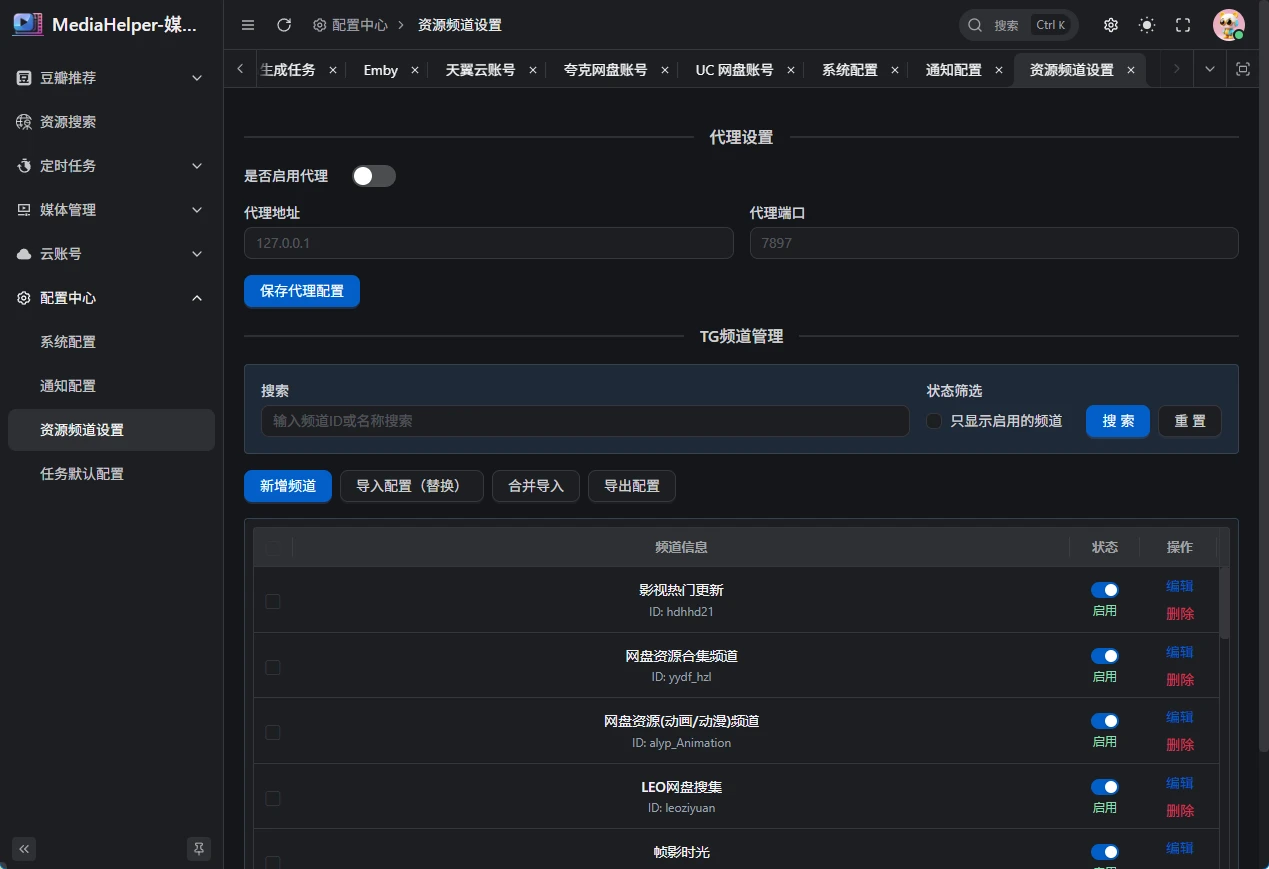 我已经配置好了频道的相关设置,所以这里可以直接看到内容,如果你没有配置的话,可能就是空白的,你需要前往「配置中心」->「资源频道设置」中,点击「导入配置(替换)」按钮选中本文提供的json文件即可。导入之后的界面如下:
