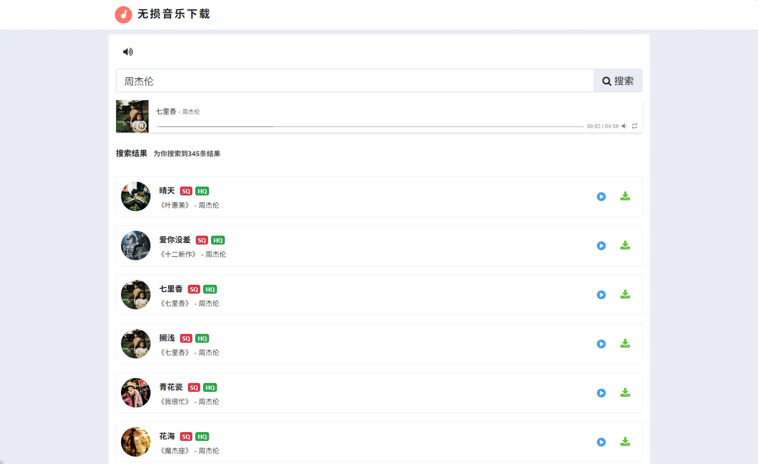 搜索结果页面大部分都有SQ和HQ标识,但是具体清晰度如何只有大家自行下载听听就知道了。