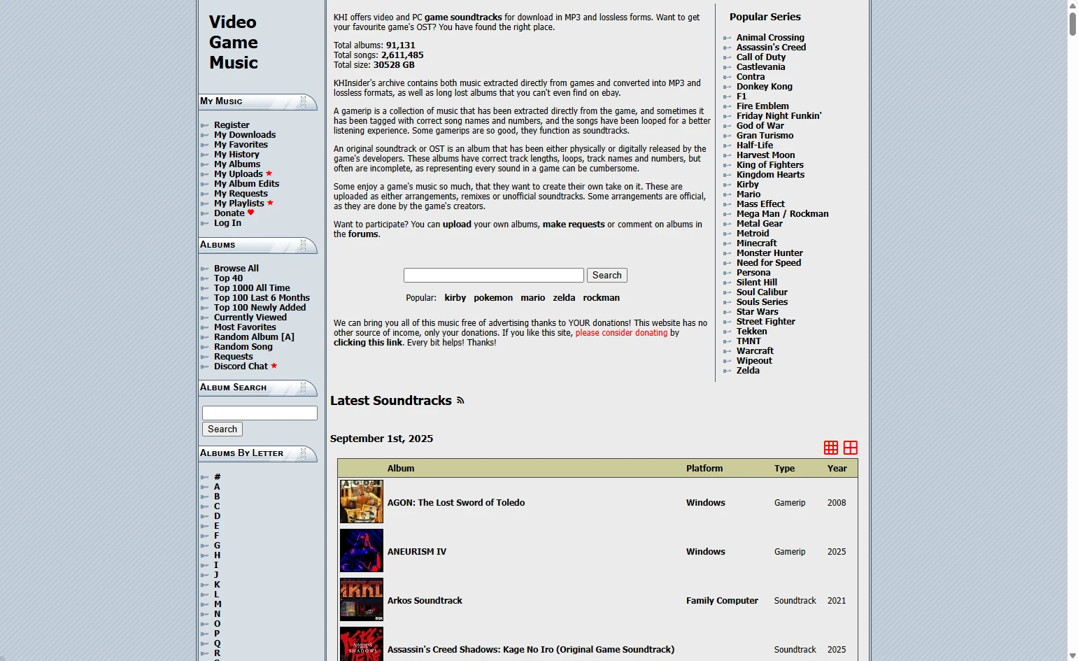站点为游戏音乐爱好者提供一个集中获取和分享游戏音乐的平台,站点内包含大量的游戏音乐,如果你针对某个游戏内的音乐特别喜欢,可以试试该站点。