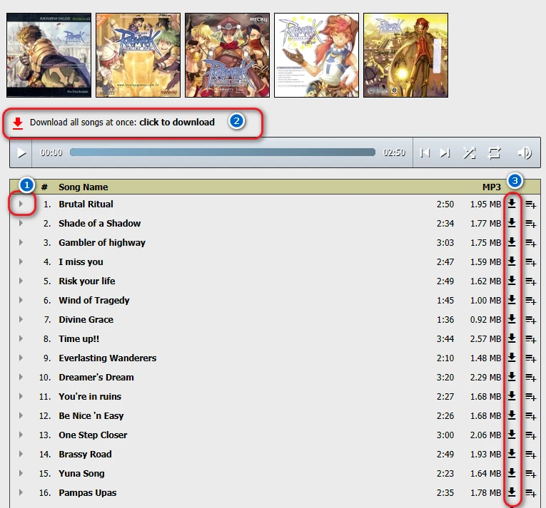 在当前页面,点击1️⃣号按钮可以直接在线试听,点击2️⃣号按钮即可直接一次下载当前列表的所有音乐,3️⃣号按钮即可选择性的下载部分音乐。