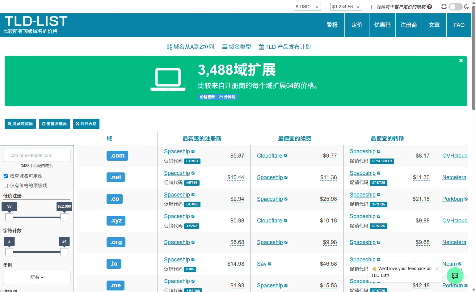 域名价格比较:提供3,488个顶级域名扩展的价格比较,涵盖注册、续费、转移等多种操作的价格信息。