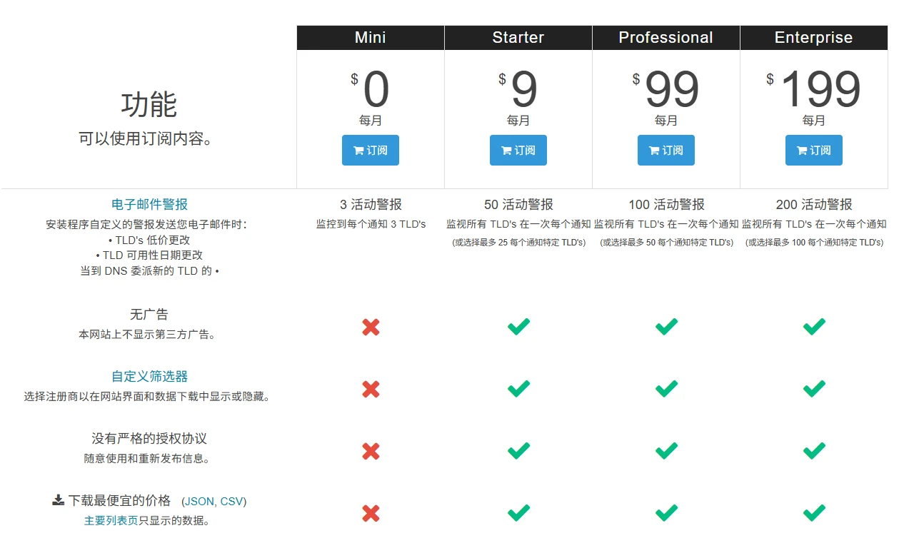 从FAQ了解到,该站点内所有的免费数据更新周期为3小时已更新,如果你需要关注某些特定的服务商或者顶级域名,可以尝试购买其付费服务,具体的截图如下: