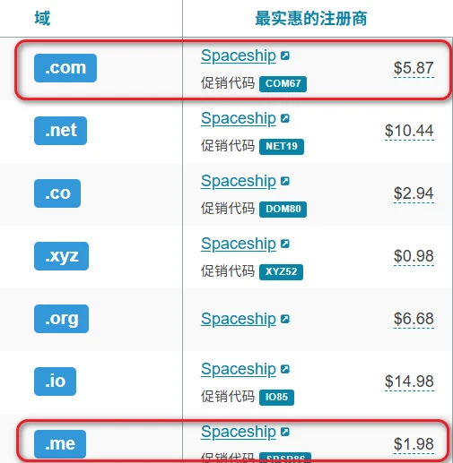 注册商信息:列出不同顶级域名的最实惠注册商,并提供链接,方便用户直接访问注册商页面。