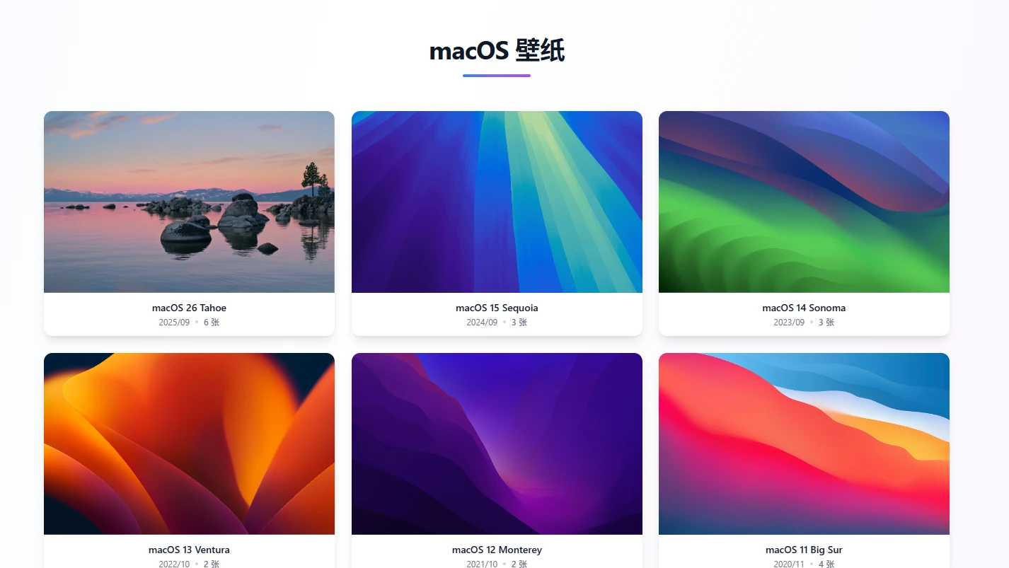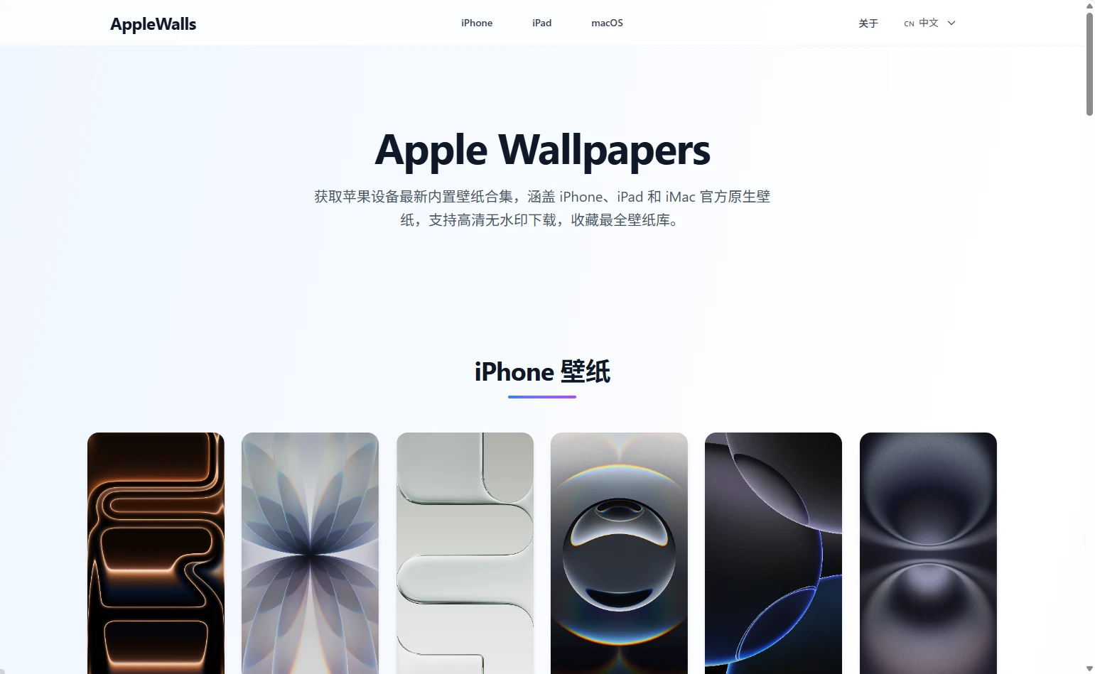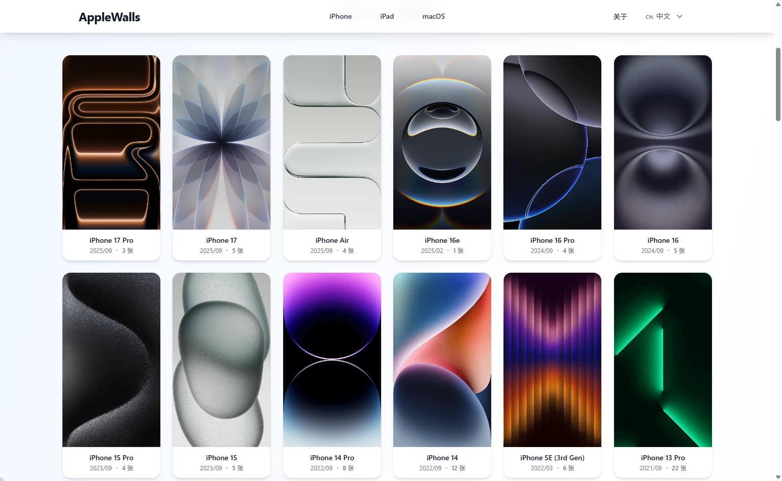 站点主要的功能和标题一样,提供苹果系类最新的内置壁纸给大家下载,每次苹果新品发布,就会有很多用户寻求相关的壁纸进行下载,如果你也是这样的情况,可以尝试收藏该站点,就不用每次都去搜索了。