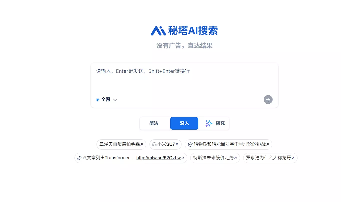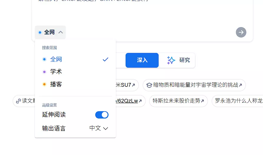 搜索界面已经决定了特性,首页提供了三种搜索搜索模式:全网、学术、博客。其次,回答方面同样提供了三种:简洁、深入、研究。