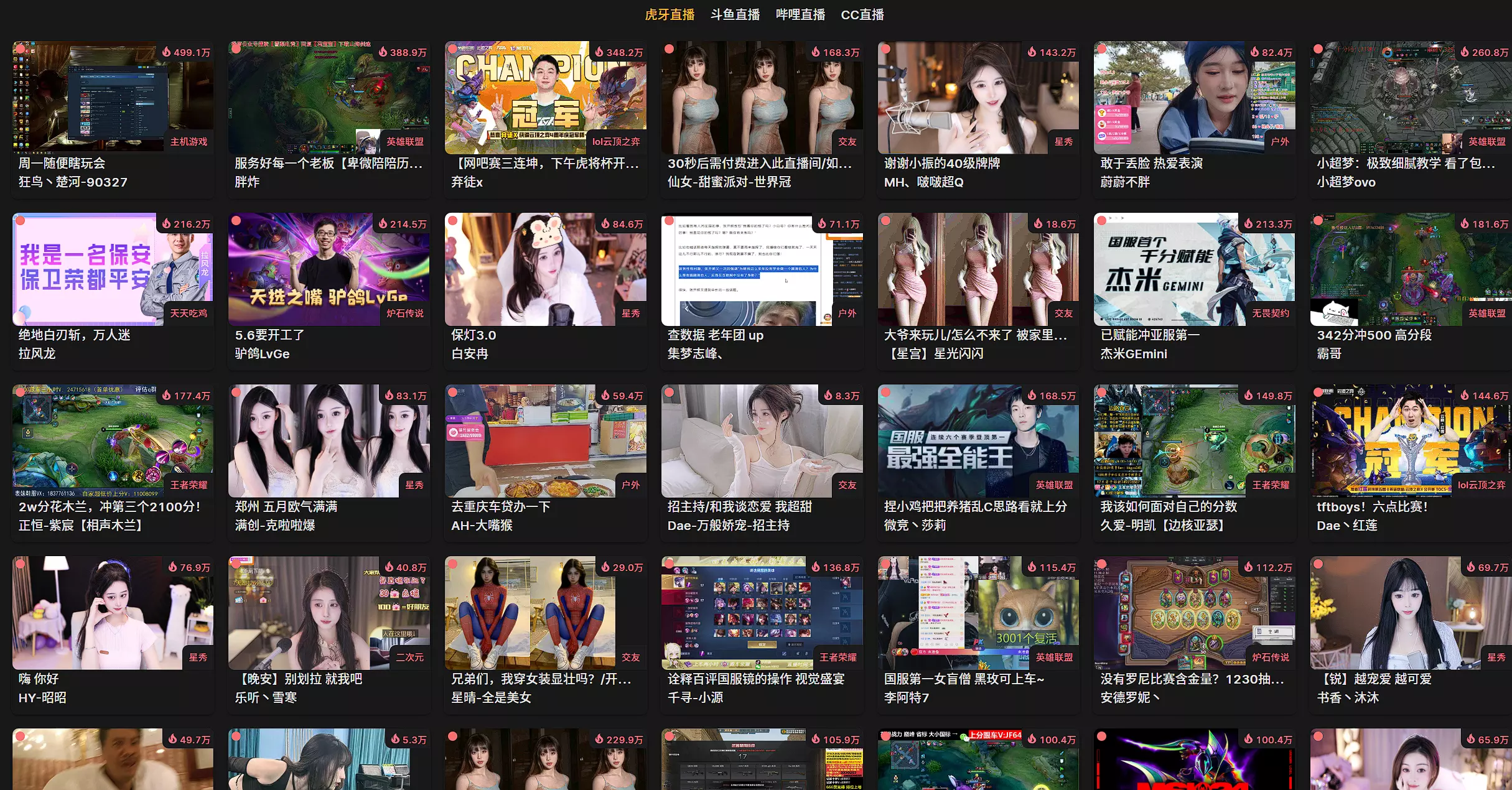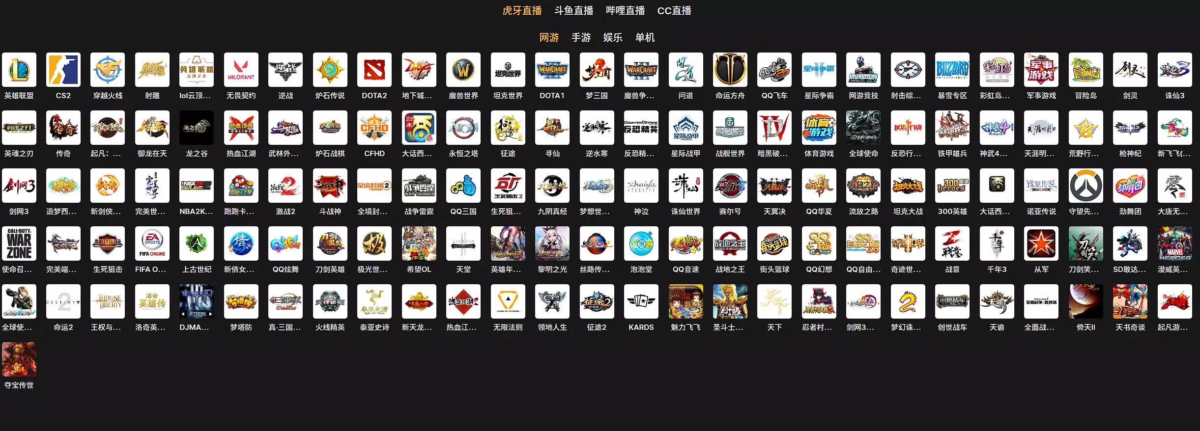 站点目前支持虎牙直播、斗鱼直播、哔哩直播、CC直播的直播聚合站点。