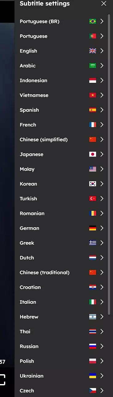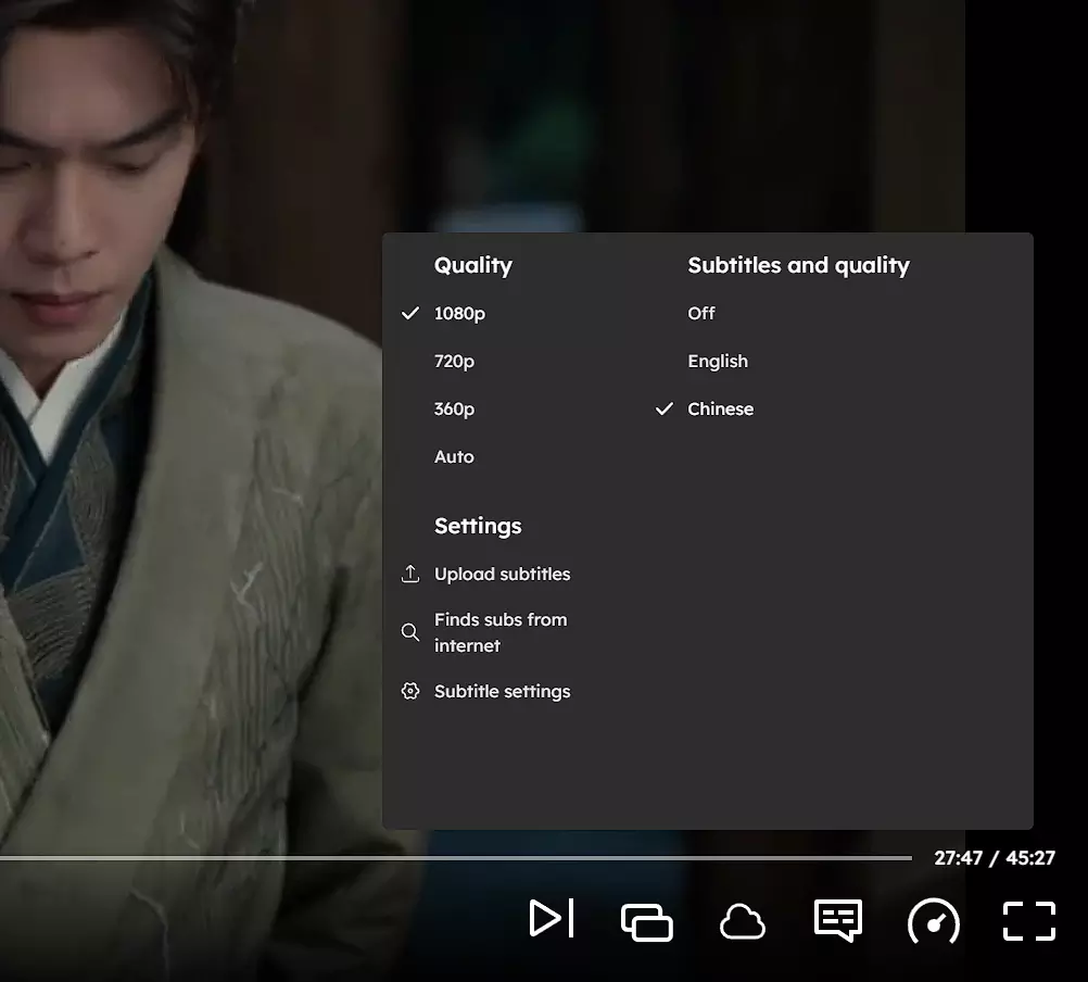 如果你喜欢看英文原版或者说你能找到字幕,可以直接通过浏览器上传字幕在线观看,这个功能还是很牛的,如果你找不到字幕,该站点也贴心的给你准备了字幕搜索功能,我随机测试了一下,简直太方便了,直接选择语言即可,不用你下载一样可以看中文。
