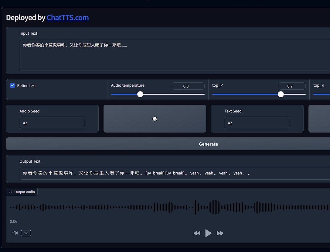 这个文字转语音是目前为止我觉得转换的最有感觉的一种,无论是语气还是自行添加的语气助词,都是相当到位的,不过经过几番调试,还是发现了一下小的问题和限制,会在文章最后说明。