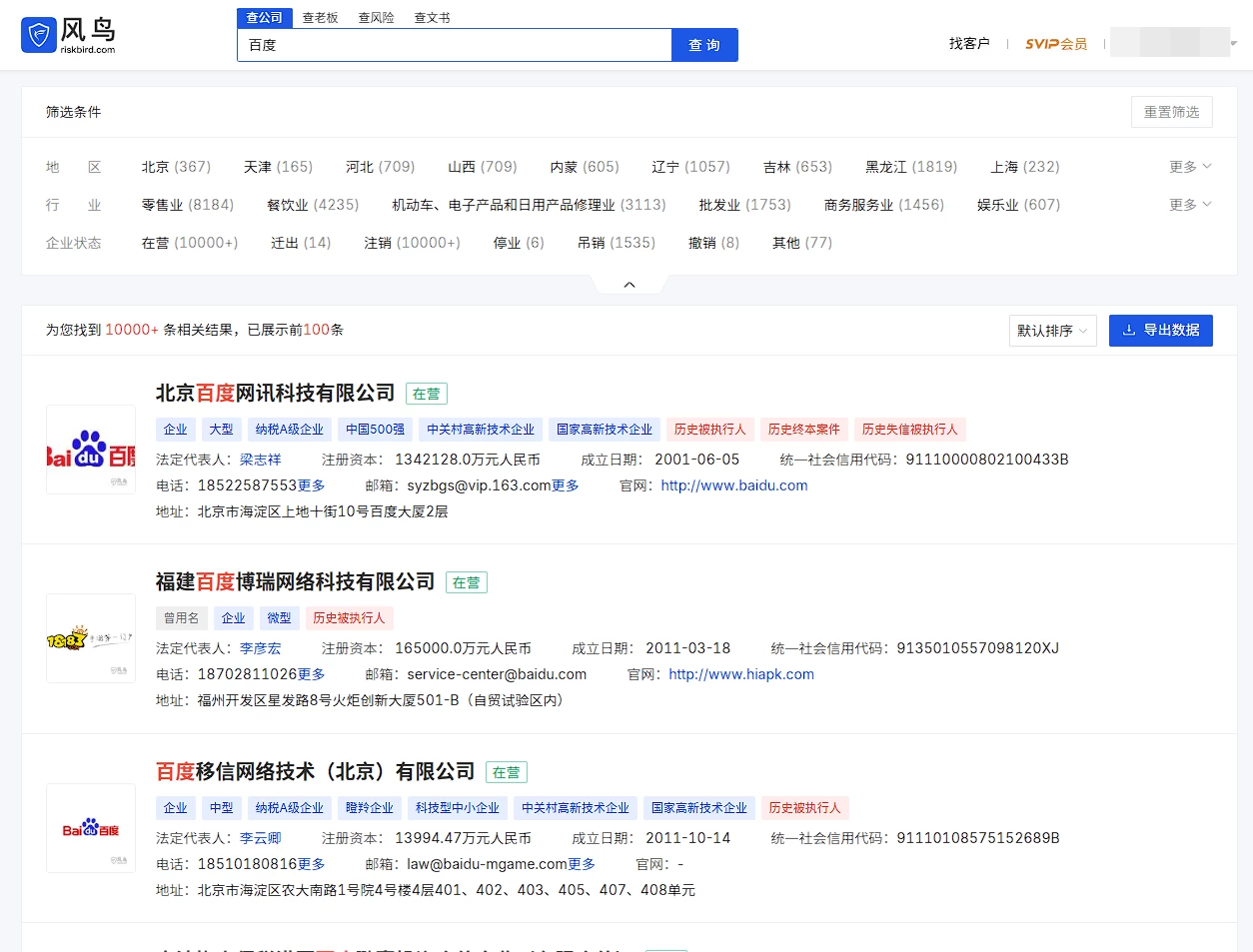 虽然我无法测试企查查的和该站点的数据差别,但是其余的方面可以适当的进行对比,相比之下,企查查在筛选条件方面明显多余风鸟,而且搜索的结果数据也是明确的,而不是风鸟的显示一个模糊的数据。