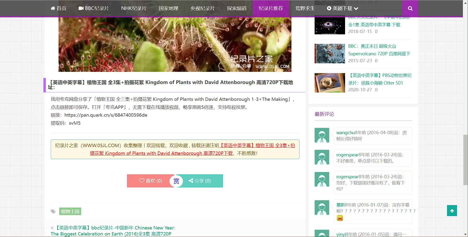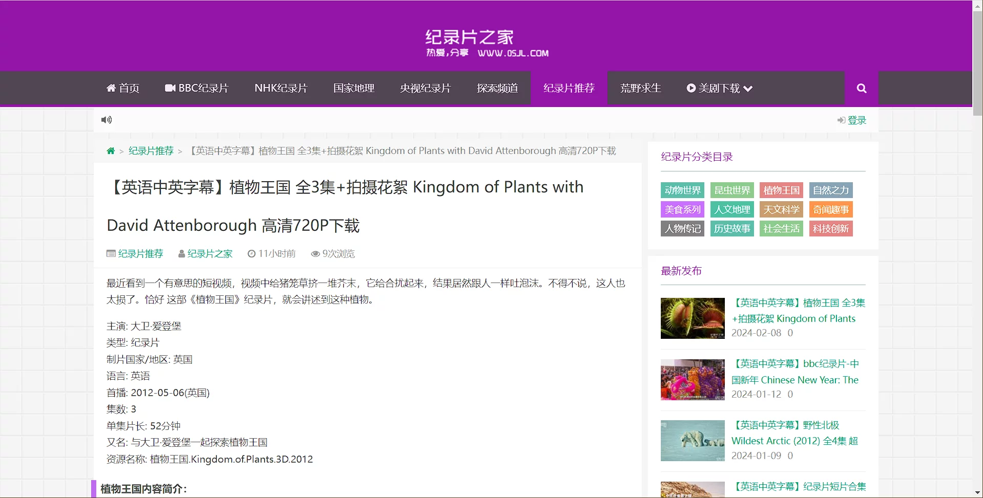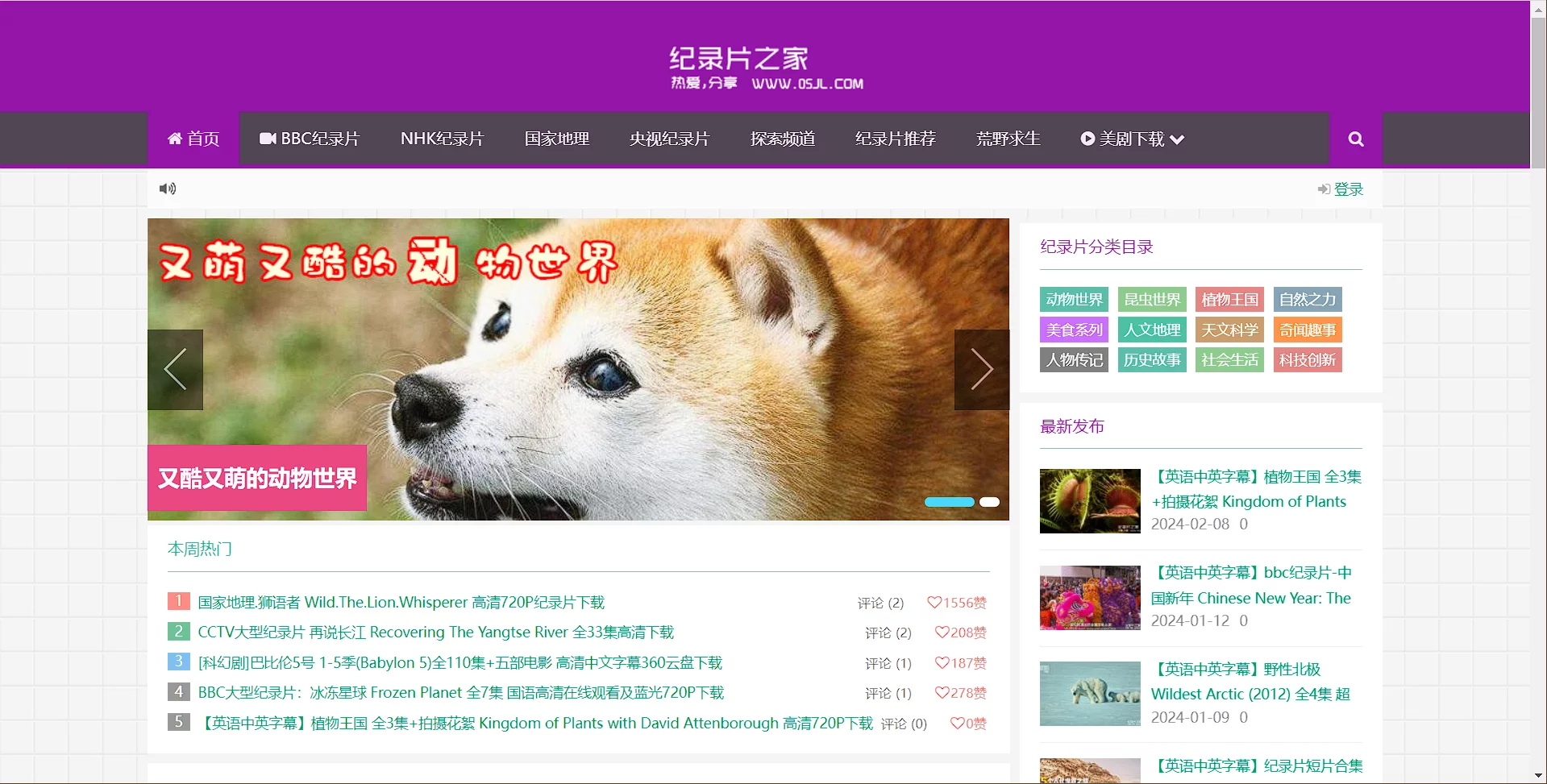 网站主要提供各种类型的纪录片系列的下载,包括动物世界、太空探索、文明历史等等。