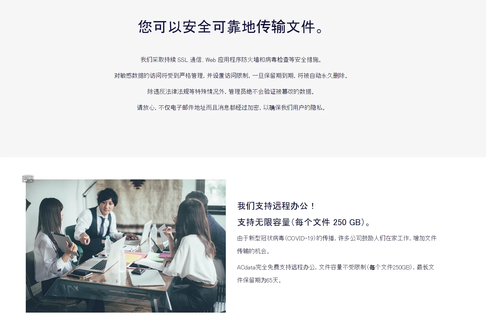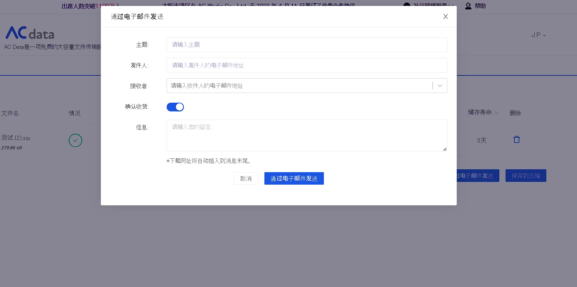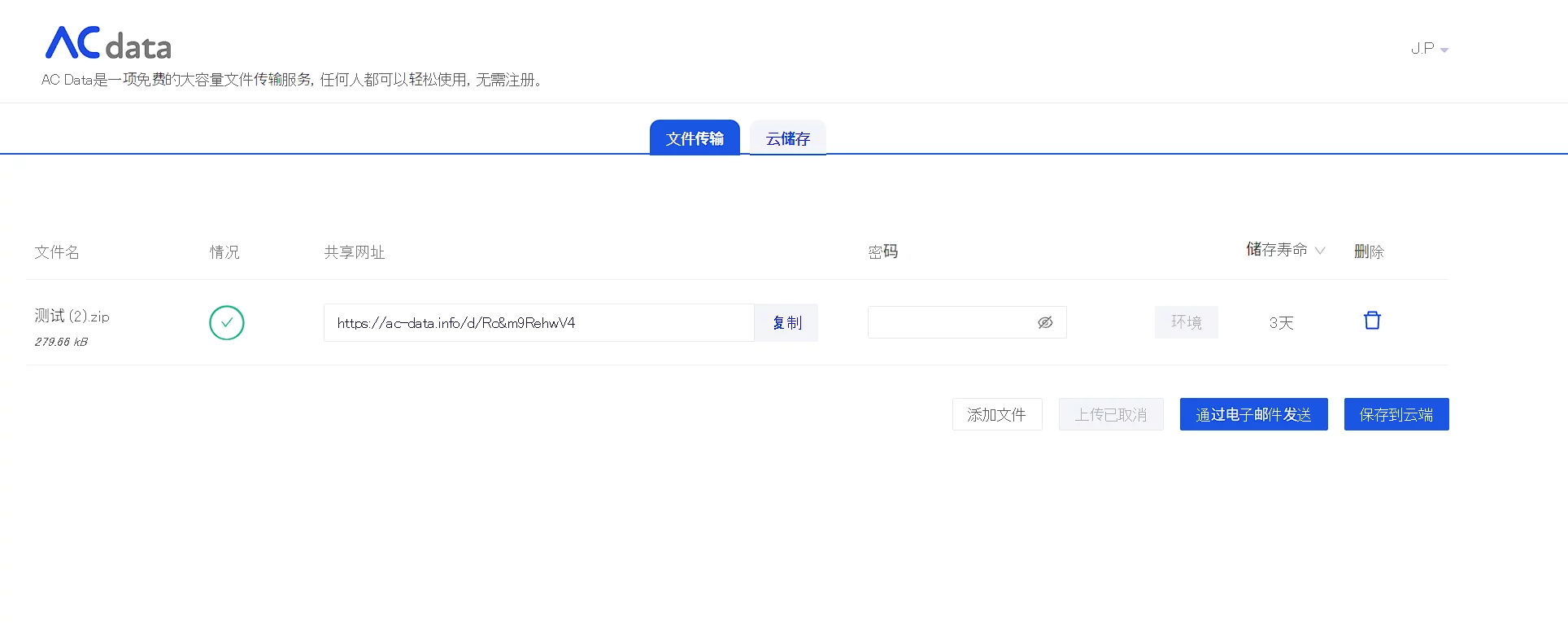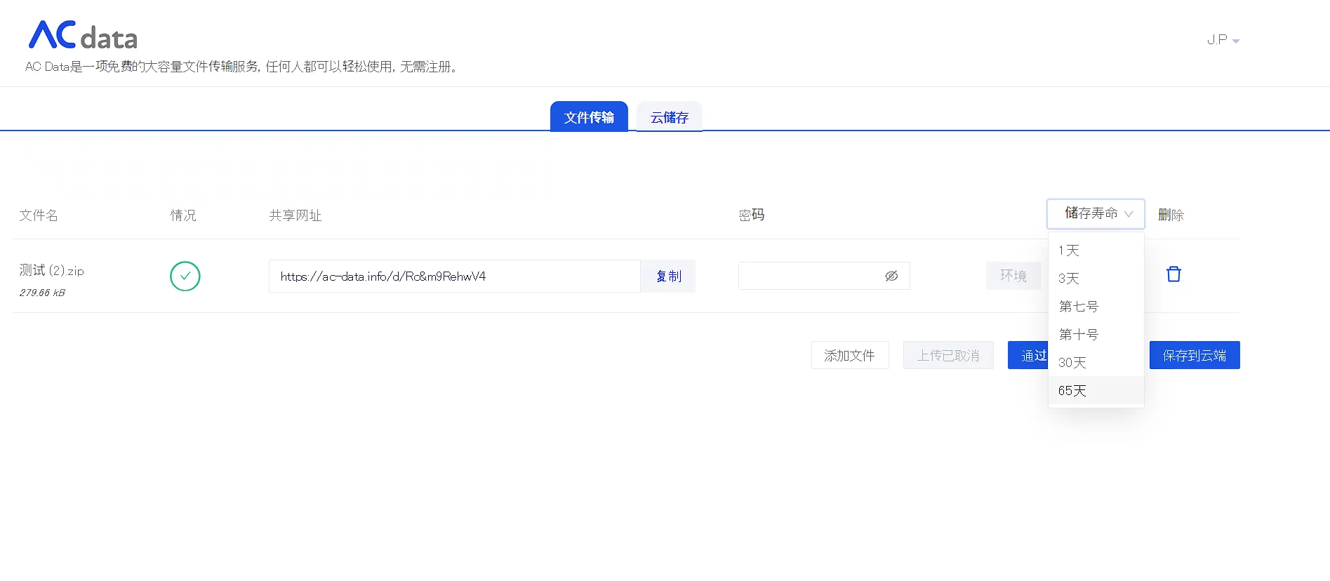 AC数据支持无限容量的传输(单个文件最大250GB)、最长65天的文件存储期限以及完全免费的服务,还提供了免费的云存储功能,可以长期保存文件(最大10GB),否则文件将在缓存被清除或上传文件后的14天后删除。