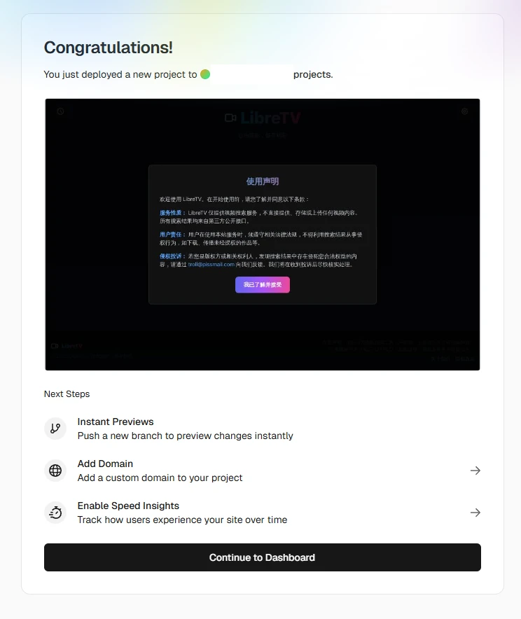上面三个过程完毕之后,即可点击上面第三张图片中下方的黑色按钮进入仪表盘,进入之后就可以看到你自己创建的项目对应的链接地址: