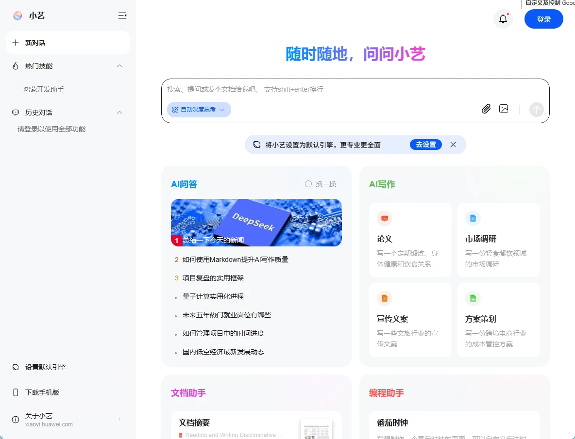 站点描述:小艺是华为公司自主研发的AI智慧助手,基于最新的人工智能技术,提供了AI知识问答、AI写作、AI文档阅读、文档助手、编码助手、鸿蒙代码生成、鸿蒙代码问答、AI识图等多种AI功能,全面提升用户的生活质量和工作学习效率,打造“随时随地 问问小艺”的便捷体验。