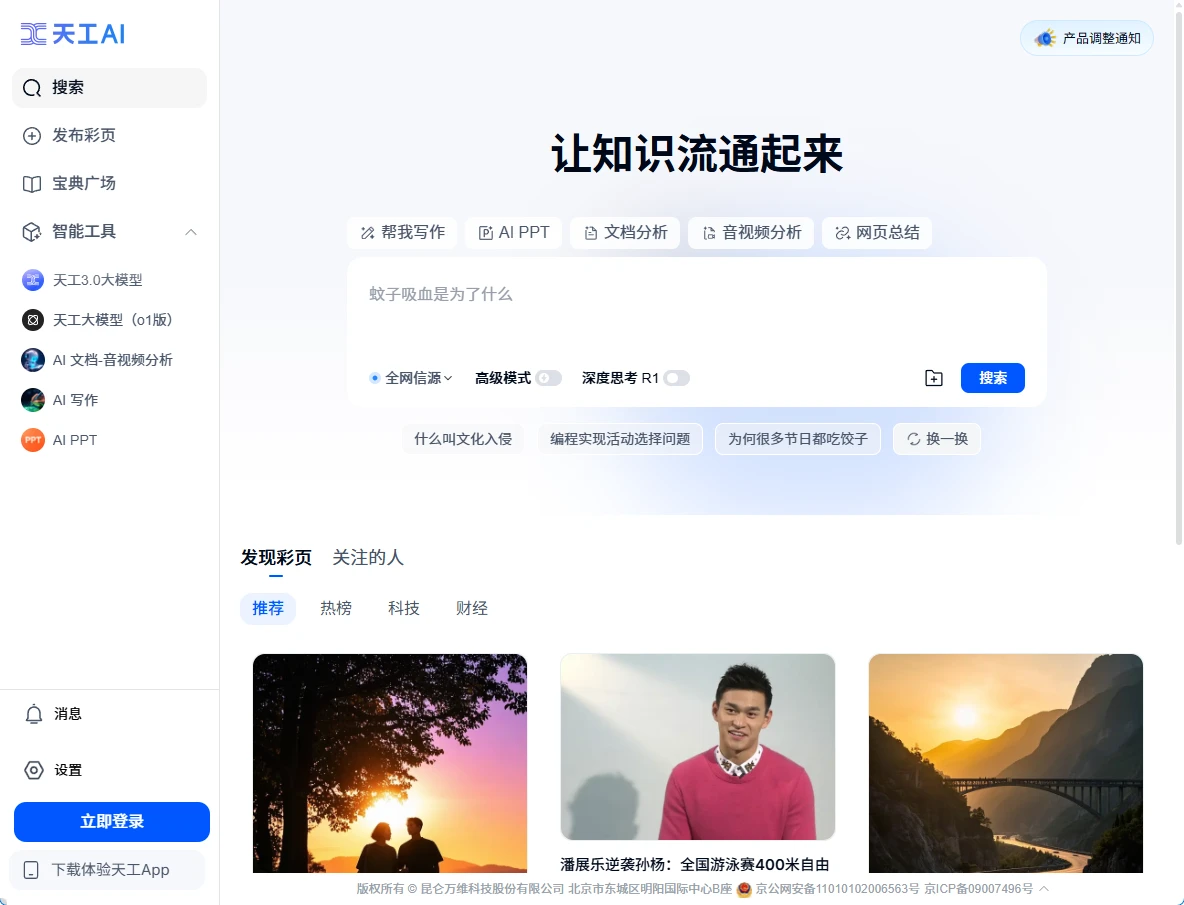 站点描述:天工是一款支持搜索、写作、对话、文档分析、画画、做PPT的全能型AI助手。你可以借助AI技术,检索信息、多语言翻译、写论文、写代码、写方案、写汇报、做PPT、归纳总结文档和音频视频,还可以智能编辑彩页和宝典,让AI生成高质量彩页内容,收获点赞关注。