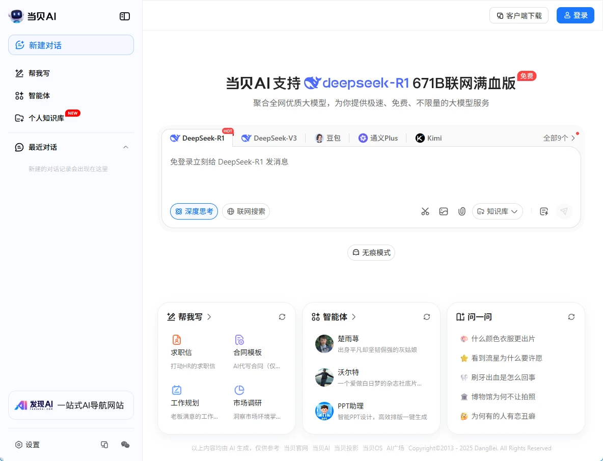 | 当贝AI | 当贝AI,免登录体验DeepSeek满血版,聚合全网优质AI大模型,如DeepSeek-R1 671B、豆包、通义千问、智谱等。当贝AI知识库,深度AI解决方案,极速、高效、免费、无需注册、不限量! | https://ai.dangbei.com |