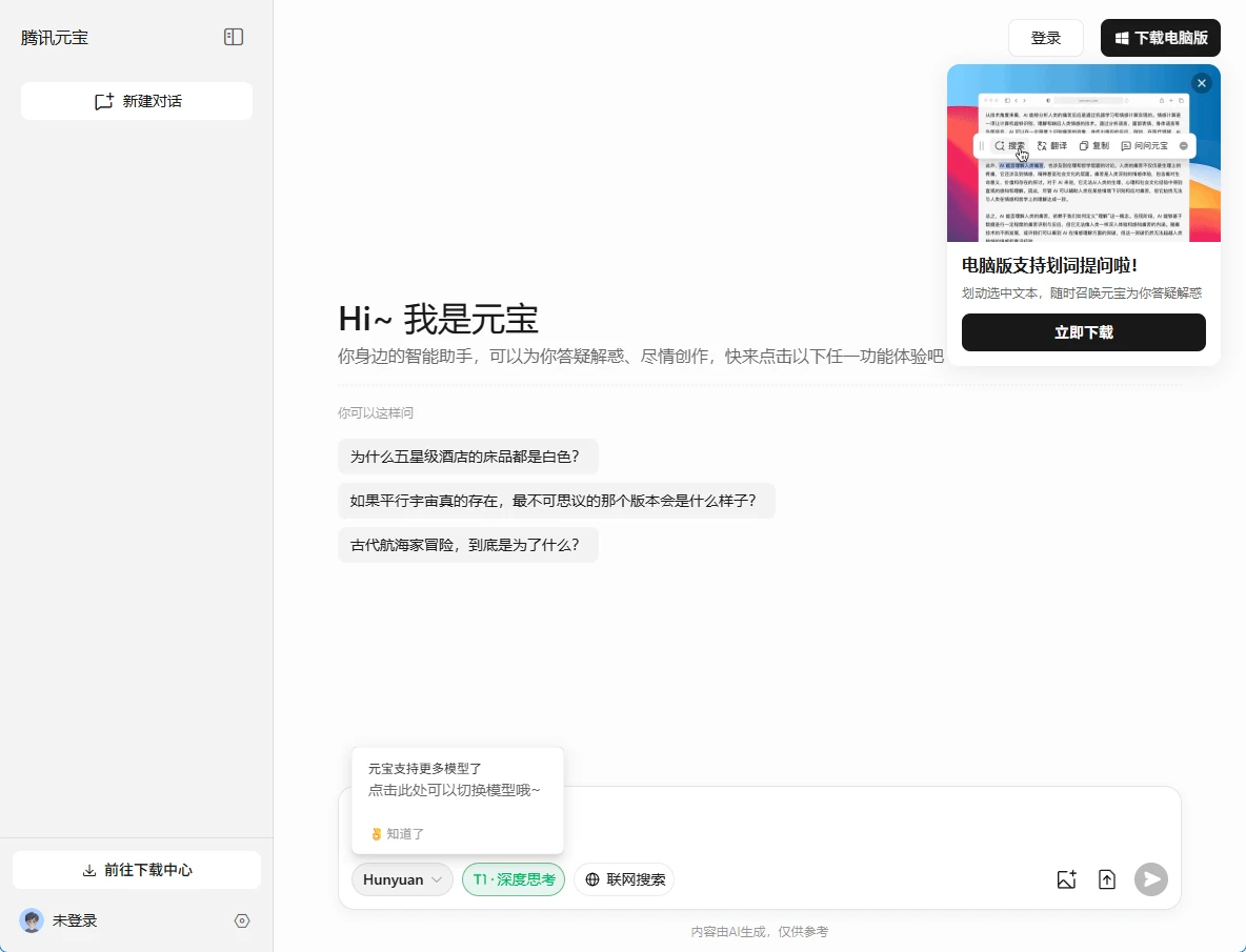 站点描述:腾讯元宝是基于腾讯混元大模型的AI应用,可以帮你写作绘画文案翻译编程搜索阅读总结的全能助手
