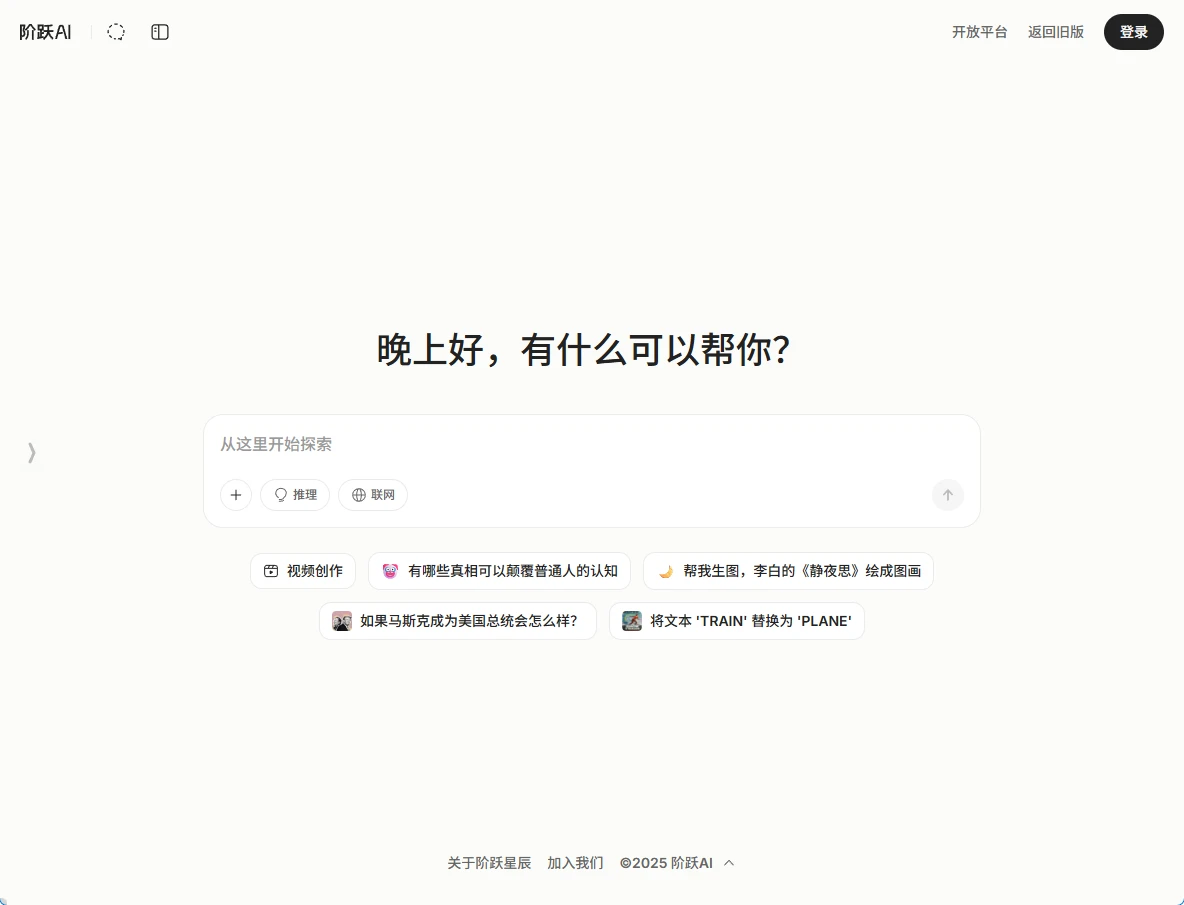 | 跃问 | 阶跃AI是一个聪明可靠的个人效率助手,可以帮你获取知识、查询信息、学习语言、创意写作、编写代码,在工作、学习、生活等各种场景下帮你解决问题。带你发现和理解世界~ | https://www.yuewen.cn |