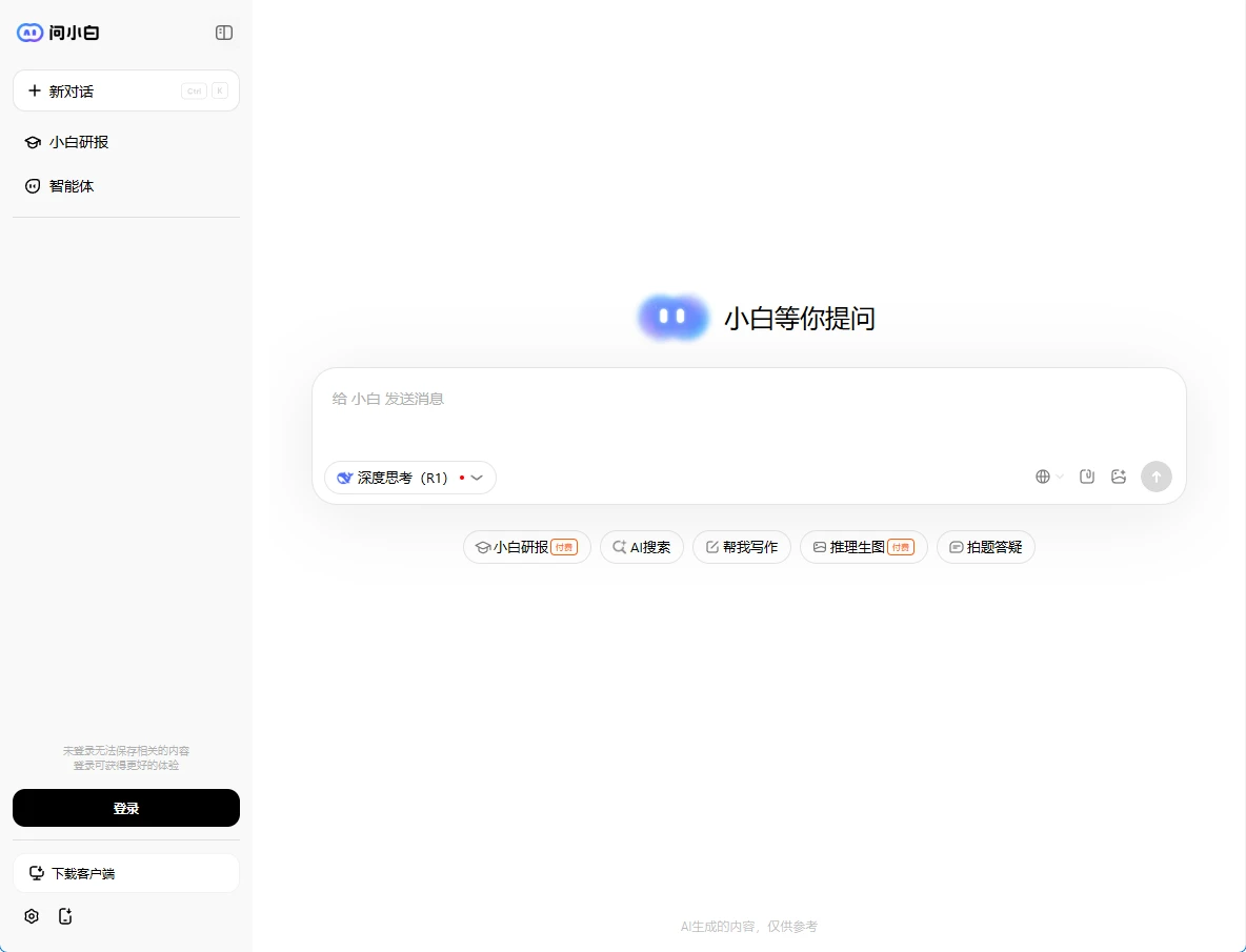 站点描述:问小白让你更有料, AI 智能聊天, 问答助手, AI 智能搜索, 免费无限量使用 DeepSeek R1 模型,支持联网搜索。