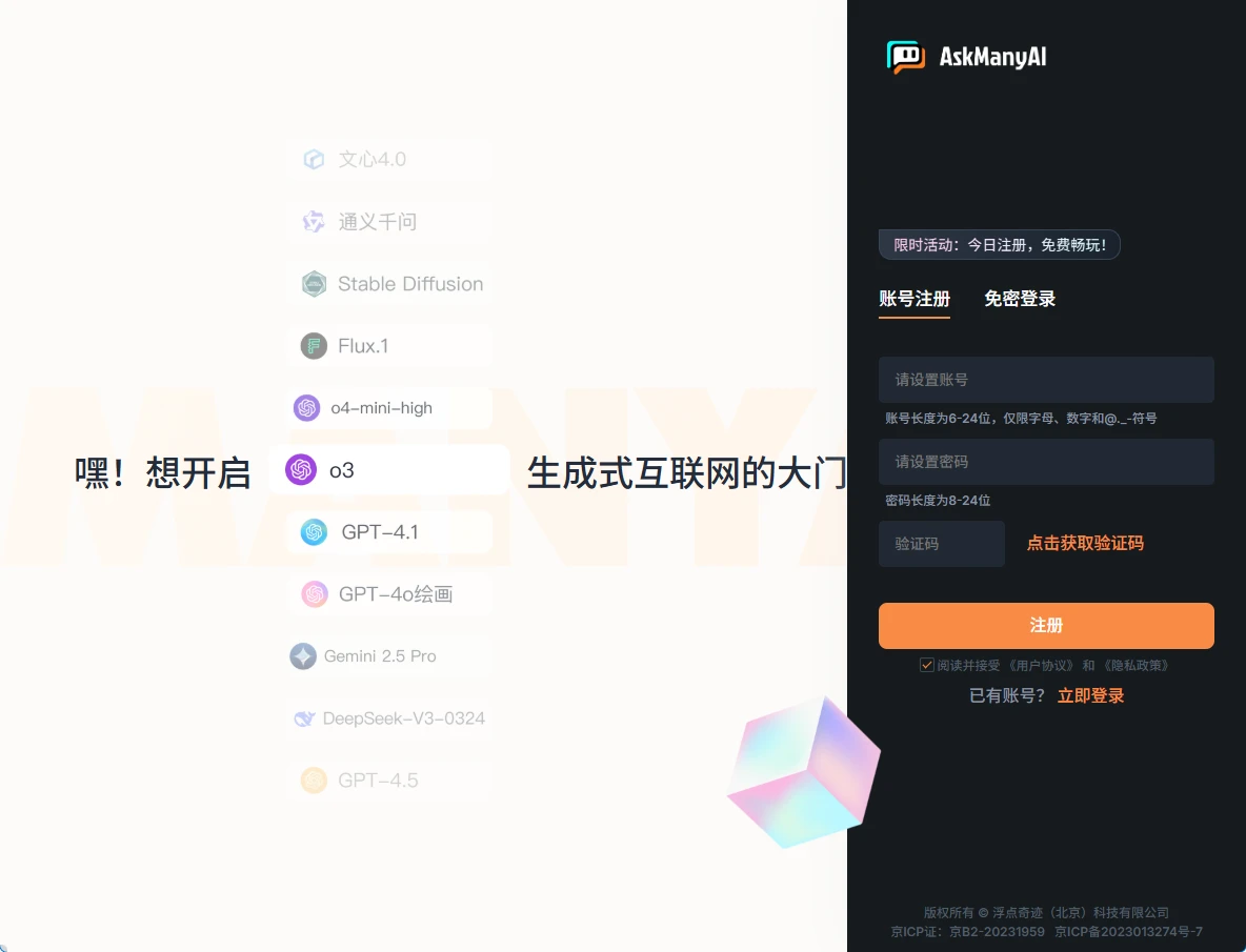 | AskManyAI | AskManyAI是一个免费的AI超级生产力平台,追求极致效率的工作学习搭子。提供免费无限次的GPT、Claude、Gemini使用,以及OpenAI O1、Claude 3.5 Sonnet、MidJourney、Perplexity等专业顶级模型的直连访问和高效横评。涵盖免费AI搜索、免费AI绘画、免费写作、免费对话等10万+必备AI工具。 | https://www.askmanyai.cn |