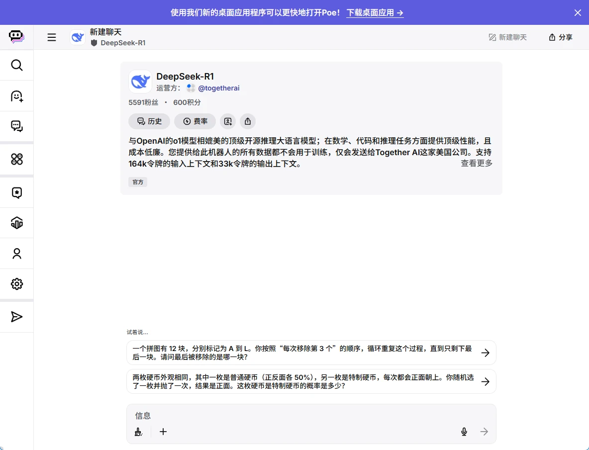 | Poe | Poe汇聚卓越人工智能,提供一站式体验。探索 GPT-4.5、Claude 3.7 Sonnet、DeepSeek-R1、Runway、ElevenLabs 以及数百万其他产品。 | https://www.poe.com/DeepSeek-R1 |