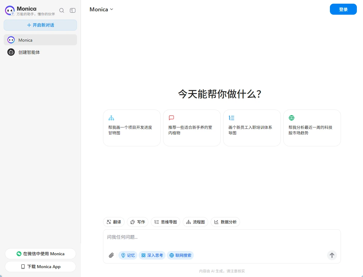 | Monica | Monica,擅长代码编写、创意构思、文档处理和回答日常问题,通过智能对话为你解决各类专业难题。 | https://www.monica.cn |