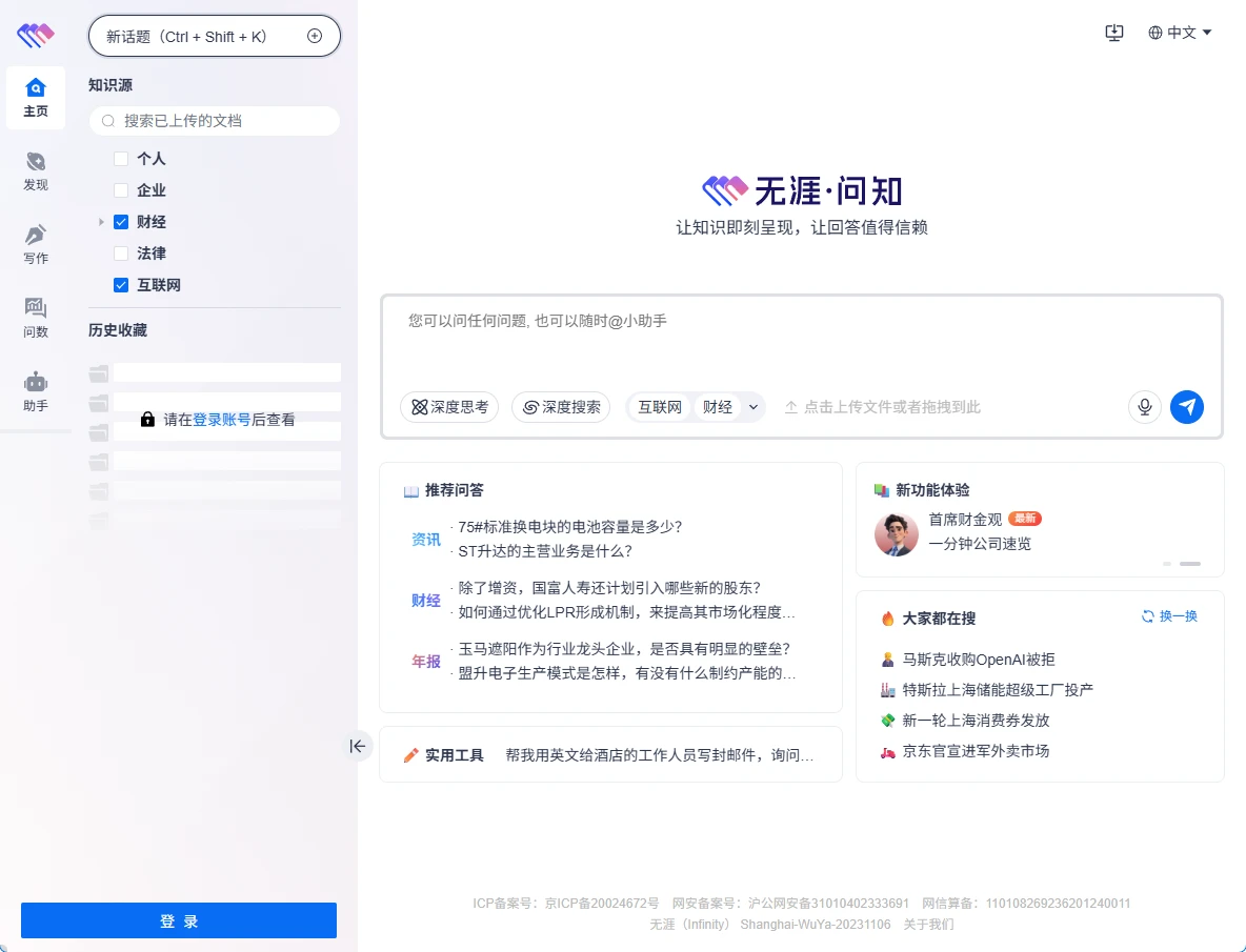 站点描述:无涯Infinity,是一款基于星环大模型底座,结合个人知识库、企业知识库、法律法规、财经等多种知识源的企业级垂直领域问答产品