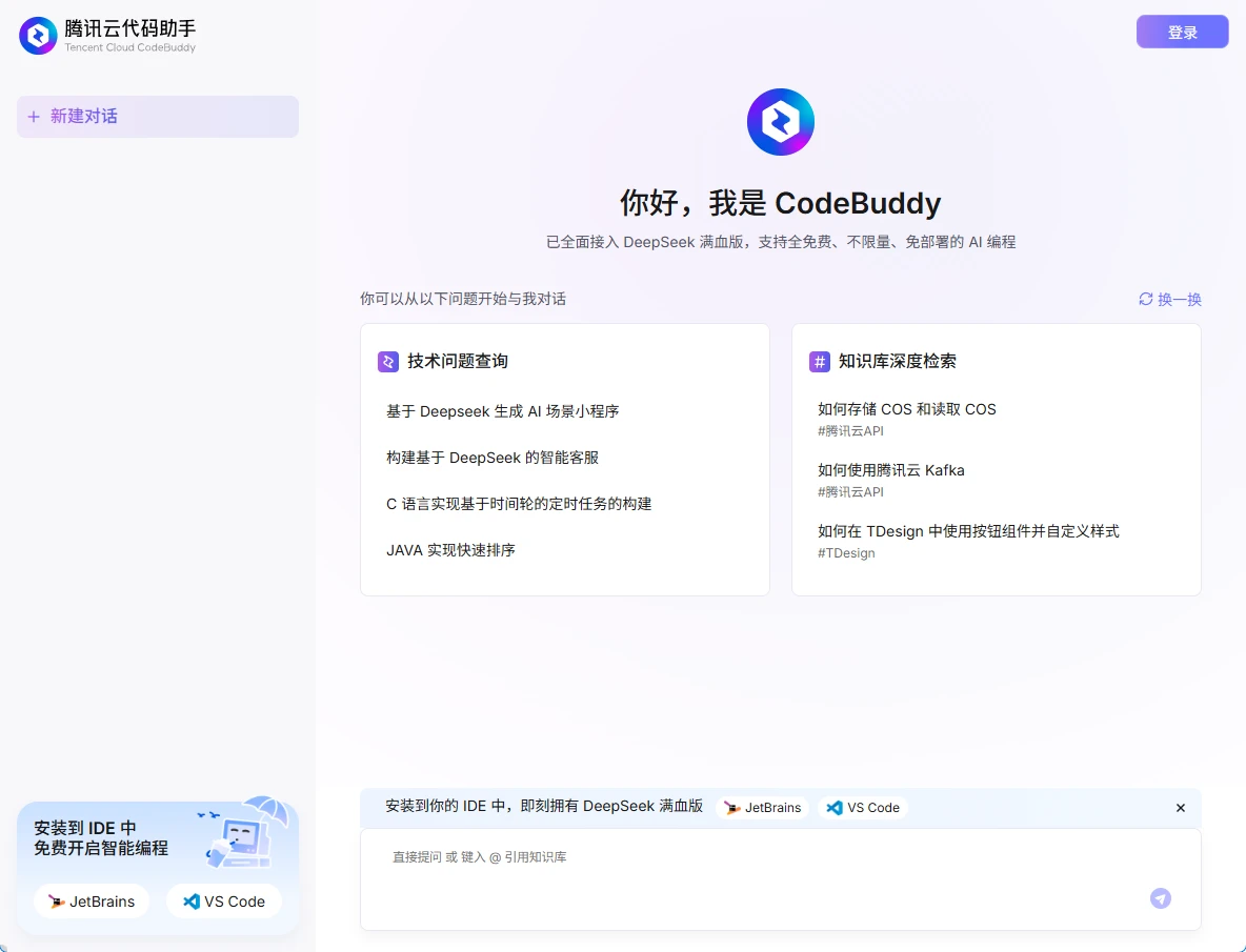 | 腾讯云AI代码助手 | 腾讯云代码助手已全面接入 DeepSeek 满血版,支持全免费、不限量、免部署的 AI 编程,让我们开始对话吧 | https://copilot.tencent.com/chat |