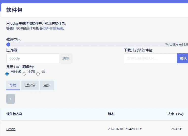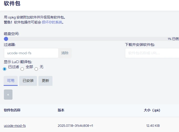 根据官方介绍,该插件支持22.03版本及其以上版本,并且依赖ucode和ucode-mod-fs两个插件,这两个插件你可以通过openwrt自带的软件包进行安装: