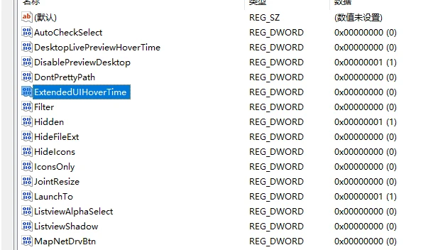 在右侧的窗口中,寻找一个名为「ExtendedUIHoverTime」的项目,如果不存在,则右键点击空白处,选择「新建」->「DWORD (32位) 值」,将新创建的DWORD值命名为「ExtendedUIHoverTime」: