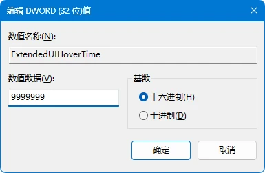 双击你刚创建的ExtendedUIHoverTime,在弹出的窗口中,将「数值数据」更改为任意一个大于10000的值,然后点击「确定」: