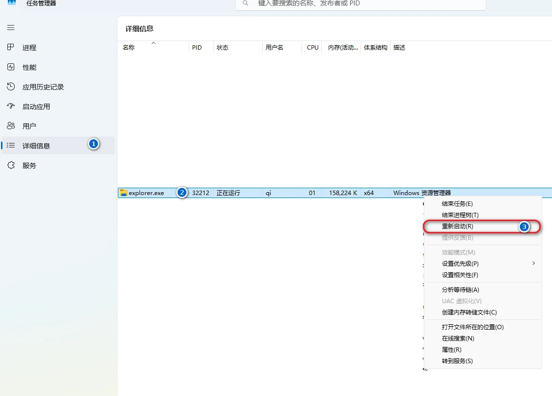 还有最后一步就是重启资源管理器,可以直接在任务栏鼠标右键,选择「任务管理器」,切换到「详细信息」之后找到一个名为「explorer.exe」的项目,再改项目上面鼠标右键,选择「重新启动」即可:
