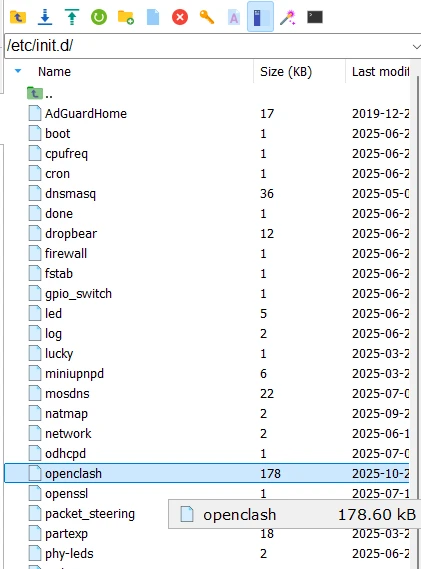 按照路径「/etc/init.d/openclash」双击打开openclash文件,如果双击没反应,可以尝试将文件下载到本地之后进行修改。