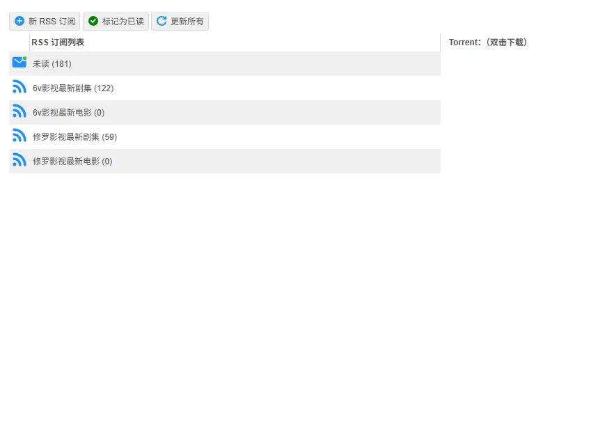 启动之后你可以进入qBittorrent首页看到右上角的「RSS」按钮,点击一下: