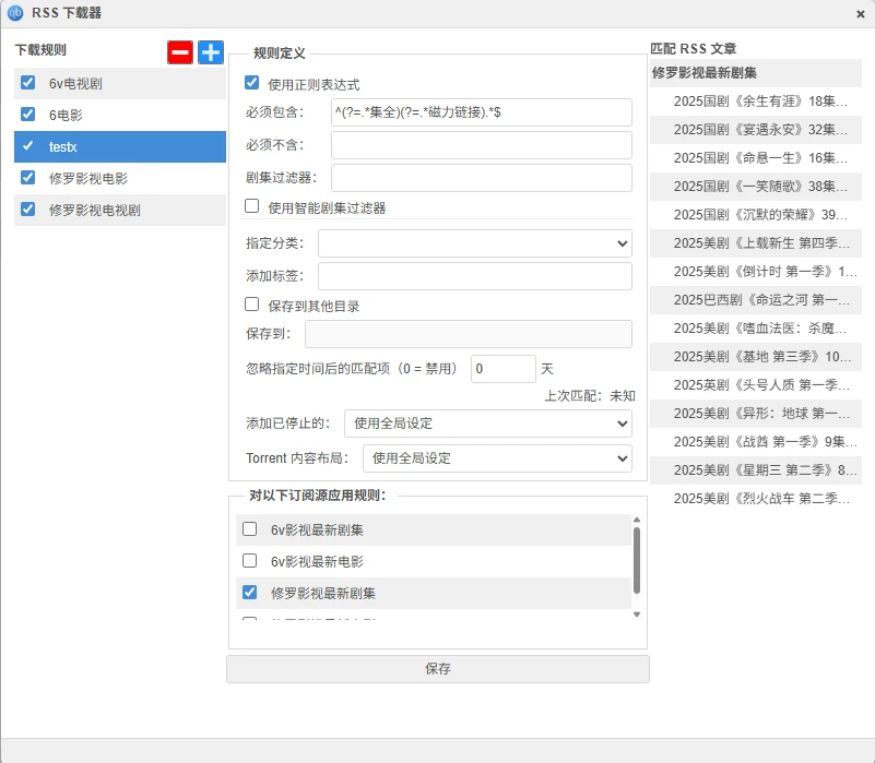 上面的表达式代表当订阅信息中同时出现「集全」和「磁力链接」两个关键词的时候就会自动添加到下载列表中。
