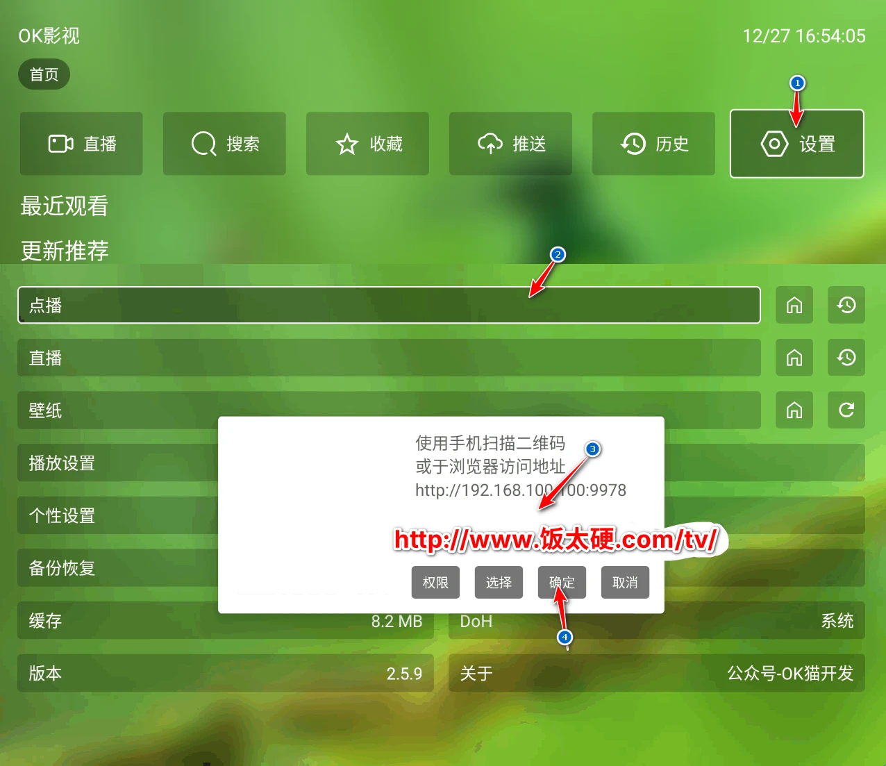 简单的描述就是安装APP之后进入APP,点击设置,之后点击2号箭头指向的内容,会弹出一个白色的框,然后在3号箭头指向的位置输入红色的文字内容:“http://www.饭太硬.com/tv/”,之后点击确定,最后返回首页,等待页面刷新即可完成,正常情况下,你可以看到下面的界面: