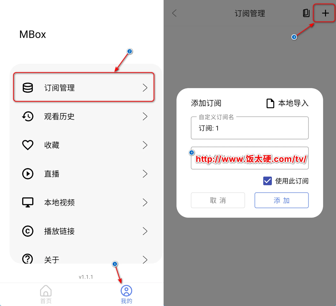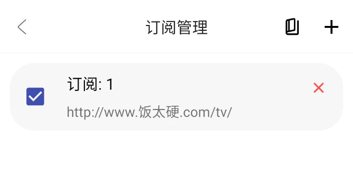 首先点击我的,之后点击订阅管理,看到右上角有一个加号,点击加号之后就可以看到输入订阅信息的框,输入红色字体内容:“http://www.饭太硬.com/tv/”,之后点击添加,等待数秒之后,就可以看到添加成功: