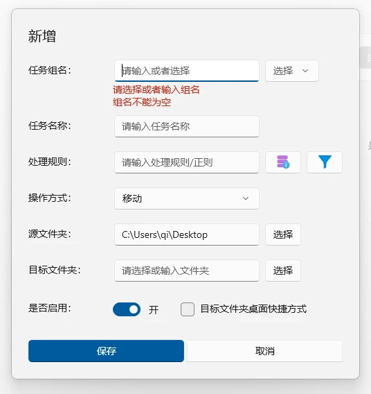 任务组就相当于任务分类,根据个人需求来取名即可,任务名称自己定义即可,处理规则这里提供两种,一种就左边一个按钮提供了针对文件和文件夹处理的内置规则,如果你觉得不能满足,可以尝试自己通过正则来进行处理,右边一个漏斗按钮则是针对高级规则中的某些文件进行过滤: