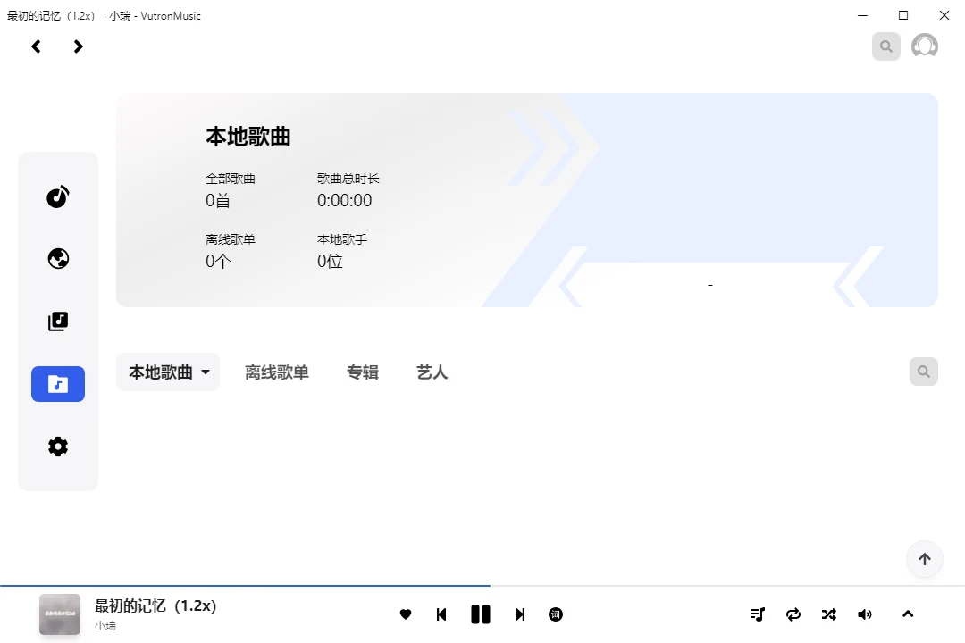 软件主界面,左边按钮部分从上至下依次是:首页、搜索、音乐库、本地音乐、设置: