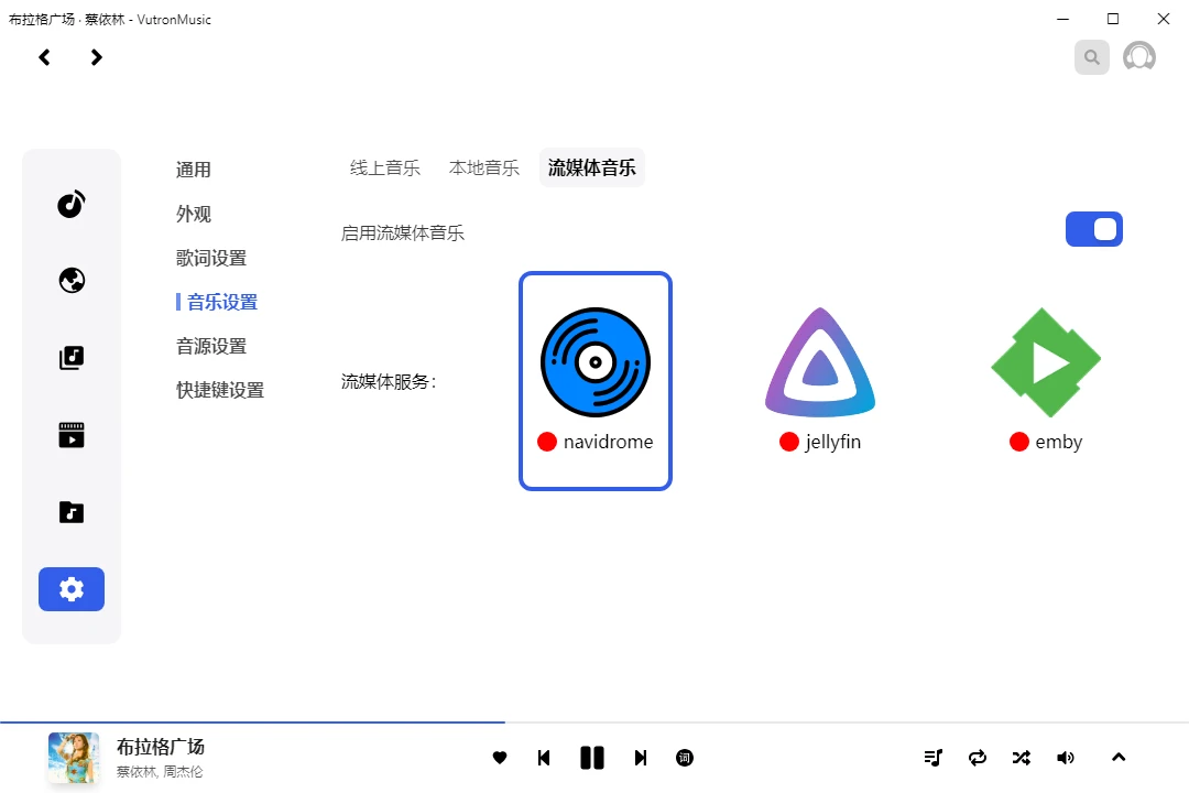 除了常规的在线听歌之外,设置里面还提供了流媒体音乐的支持: