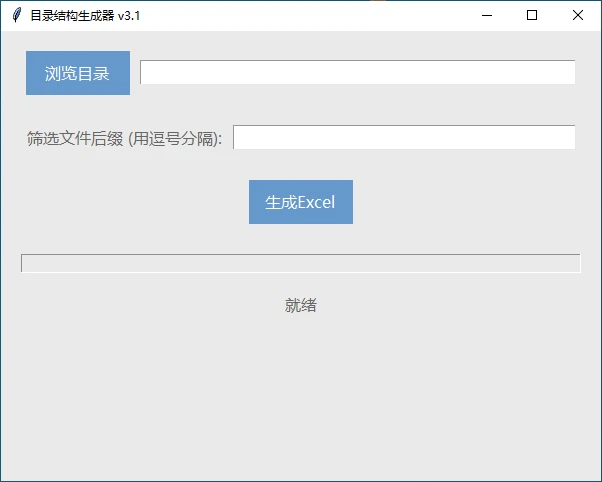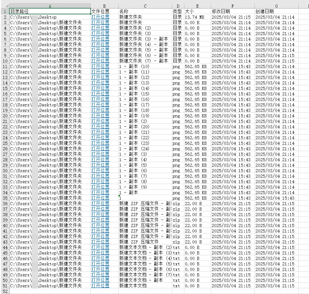 3.生成 Excel 文件:程序会将目录结构信息(包括目录路径、名称、类型、大小、修改日期、创建时间、文件位置)导出到 Excel 文件中。