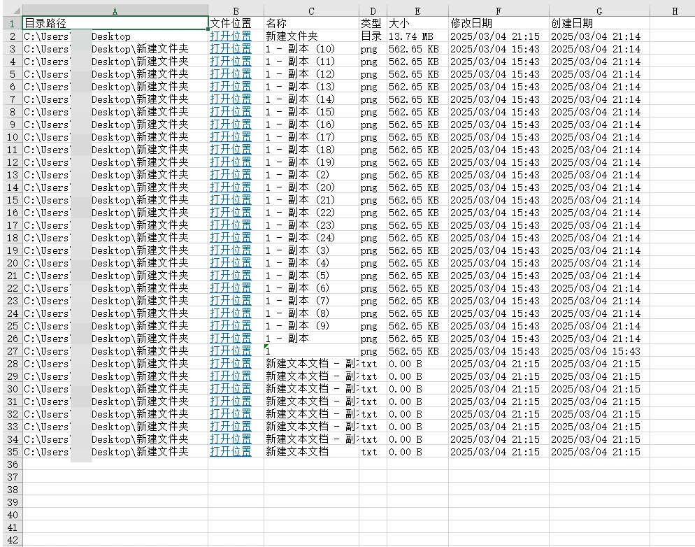 5.超链接功能:生成的 Excel 文件中包含超链接,点击可以打开文件所在位置。