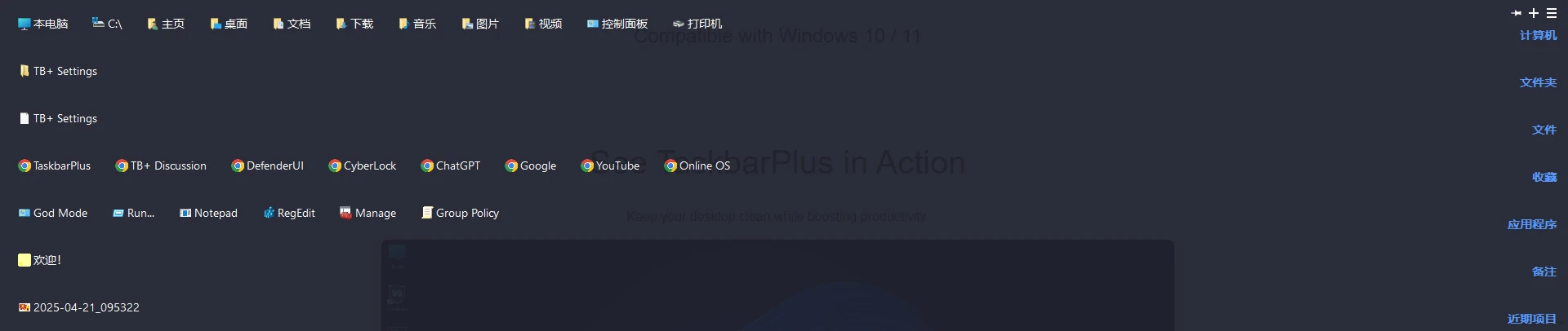 TaskbarPlus 是一款智能且直观的桌面增强实用程序,它通过提供对文件夹、文件、快捷方式等的快速访问来补充 Windows 任务栏,从而保持桌面整洁并使您的工作流程无缝高效。