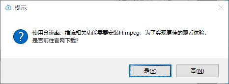 软件运行之后,点击启动,会弹窗告知你,如果需要推流等功能,需要安装ffmpeg工具,如果你需要的话,以点击「是」前往页面下载,如果不需要,直接点击「否」即可: